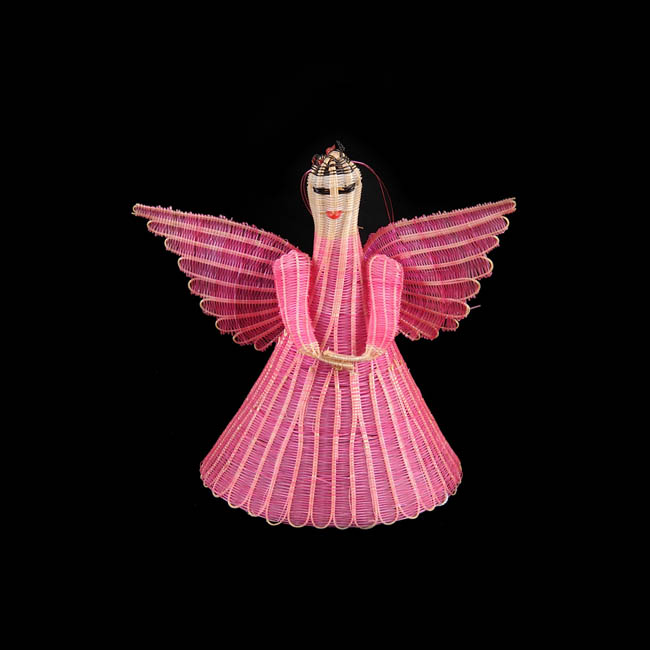 Objeto antropomorfo de uso decorativo. Tiene alas , manos juntas adelante y pelo corto desde el cual salen dos hebras de crin a modo de colgante. Es de color rosado con alas del mismo color, el pelo es negro y tiene una boca de color rojo. La figura central esta elaborada en una estructura de ixtle sobre la cual pasa el tejido de crin sin teñir. Los brazos y alas son estructuras distintas que van cosidas.
