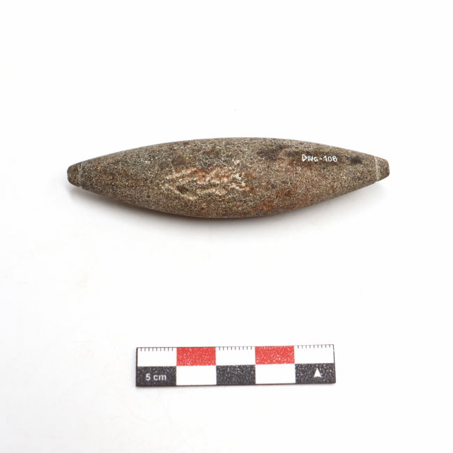 Pesa de pesca tipo cigarro. Su forma general es cilíndrica de sección ovalada con extremos muy apuntados. Presenta dos incisos circulares en cada extremo, los cuales dan una vuelta semicompleta al diámetro de cada punta de la pesa .