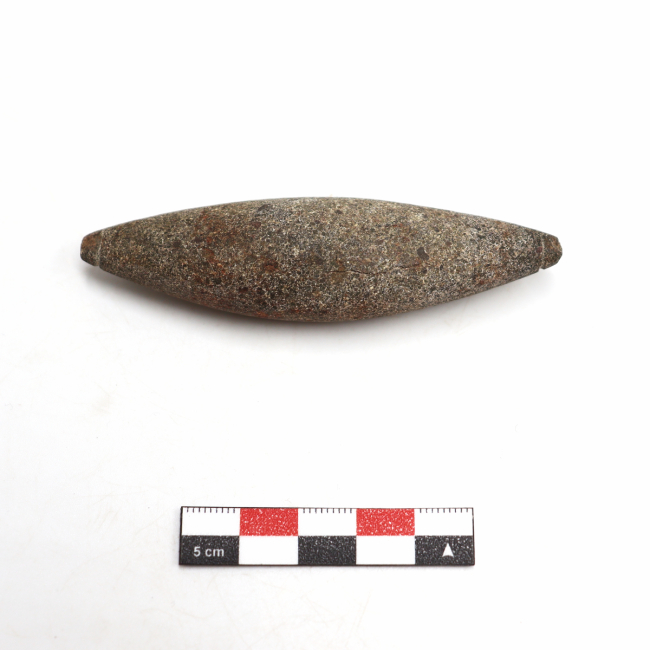 La pieza corresponde a una pesa lítica utilizada como elemento de inmersión dentro de un aparejo de pesca con anzuelo. Su función principal es permitir que el sistema descienda hasta la profundidad donde se encuentran los peces, asegurando que el anzuelo alcance el hábitat del recurso. En este tipo de pesca, el pescador dispone el aparejo en el agua compuesto por una línea, un anzuelo y una pesa: esta última actúa como lastre, manteniendo la línea tensa y facilitando el hundimiento del conjunto.
