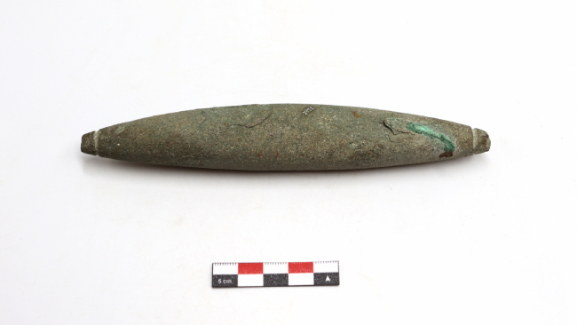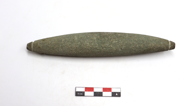Pesa de pesca tipo cigarro. Su forma general es cilíndrica de sección ovalada con extremos muy apuntados. Presenta dos incisos circulares en cada extremo, uno da una vuelta semicompleta al diámetro de la punta de la pesa y el otro una vuelta completa. Tiene una impresión de anzuelo en su superficie