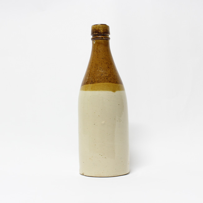 Pieza de forma cilíndrica de color beige la sección inferior, y color marrón en la sección superior, con una franja de color mostaza en el borde. Tiene leves faltantes en la boca. Es una pieza simétrica, de estructura restringida con cuello, de perfil compuesto; la base es circular de contorno plano. La botella es de tipo sinusoidal con el cuerpo cilíndrico; los hombros suavemente redondeados, cuello cónico con un anillo redondeado en la sección superior. La boca es de labio levemente redondeado y borde amplio, tipo listón superpuesto, con preparación para cierre a presión. El cuerpo presenta algunas irregularidades, y en el talón hay un pequeño sello impreso apenas visible donde se distinguen las letras “…URR..”., y podría corresponder a la fábrica de botellas Murray & Cia. Es una botella de cerveza.