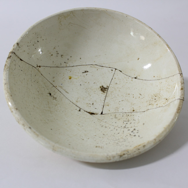 Pieza fragmentada de forma semi-esferoide. La superficie exterior es de color blanco con una franja color mostaza cerca del borde, y está coronada con una perilla cupular de color blanco con franjas color mostaza; la superficie interior es blanca. La pieza es de perfil cóncavo-convexo y el borde es invertido. Corresponde a una tapa de azucarero.