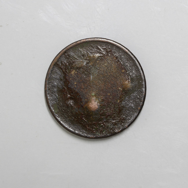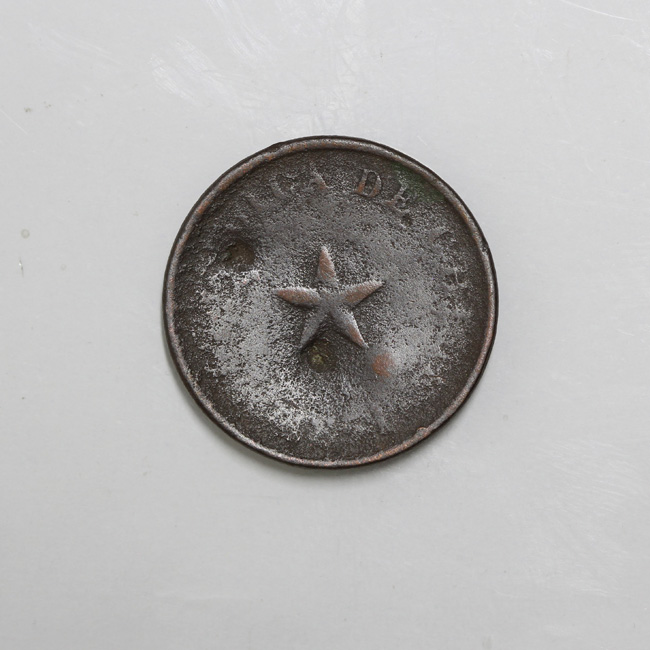 Pieza completa de forma circular y cubierta por una pátina de color marrón rojizo. Tiene dos concavidades en el anverso que siguieren un golpe con un objeto puntiagudo que no alcanzó a perforar la pieza. La superficie del anverso está limada de modo que parte de la leyenda perimetral y del año de acuñación ya no está o es apenas legible. Se distingue una figura plana central de una estrella de cinco puntas, y la leyenda perimetral “[REPU]BLICA DE CHILE”, abajo el año de acuñación [18]51. La gráfila y canto son lisos. El reverso fue borrado. Parece corresponder a una moneda de un centavo de 1851.