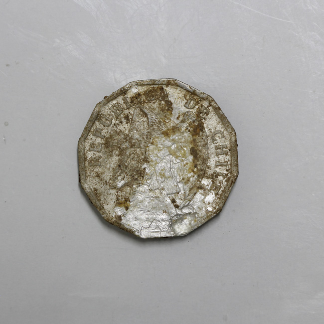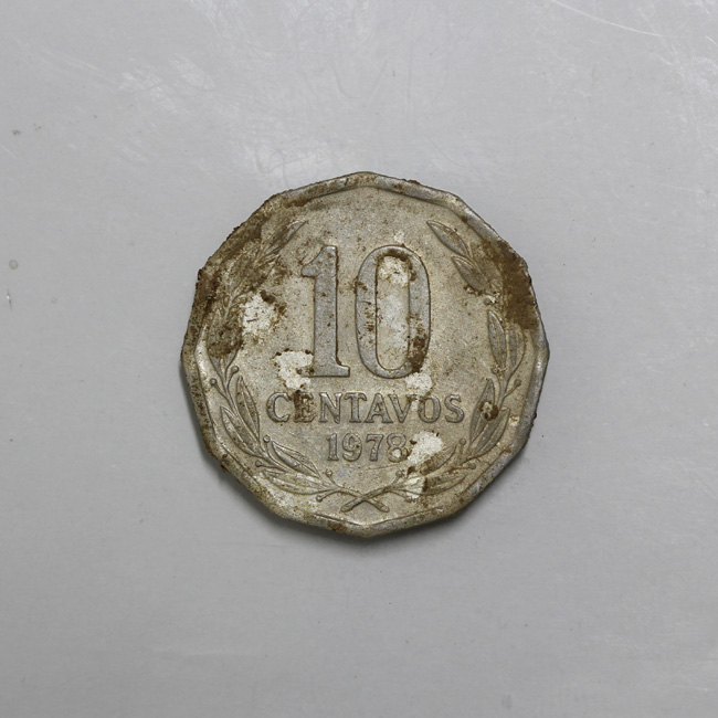 Pieza completa de forma dodecágona y de color blanco plateado; con restos de sedimento en ambas caras y destrucción de la superficie en el reverso. El anverso está hundido en el extremo inferior y muestra la figura de un cóndor a la izquierda posado sobre una montaña con las alas semi plegadas, y la leyenda perimetral “REPUBLICA DE CHILE”. En el reverso se encuentra una corona de laurel y al centro la denominación y año de acuñación: 10/ CENTAVOS/ 1978. La gráfila y el canto son lisos. La posición de los cuños es 6:00 h.