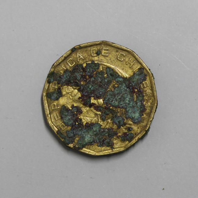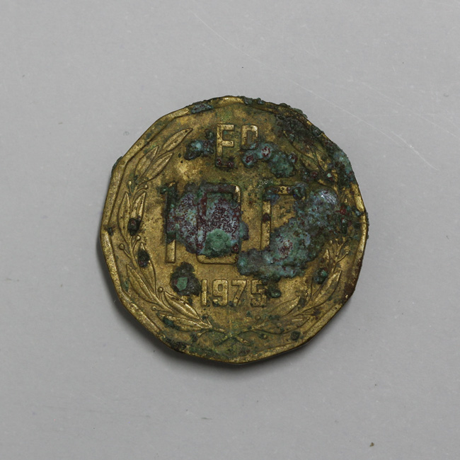 Pieza de forma dodecágona y de color dorado, con restos de óxido en ambas caras. En el anverso se distingue la figura de un cóndor a la derecha posado sobre una montaña con las alas semi desplegadas, y la inscripción perimetral “REPUBLICA DE CHILE”. En el reverso se observa una corona de laureles, y al centro la denominación y año de acuñación: E°/ 100/ 1975. La gráfila y el canto son lisos. La posición de los cuños es de 6:00 h.