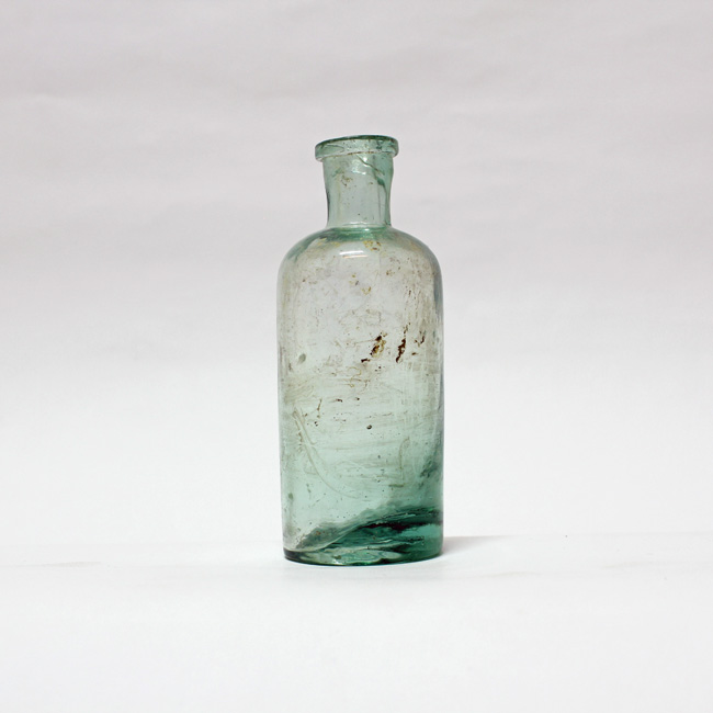 Pieza completa de color natural del vidrio y de variedad transparente. El cuerpo es cilíndrico; los hombros son redondeados; el cuello es corto y levemente cónico, irregular, la boca es de labio amplio y plano con un borde recto, asimétrica, con preparación para cierre a presión. La base es cóncava y de borde redondeado. Se observa una costura en la base y dos laterales que van de la base al cuello. En la base tiene grabado el número 100