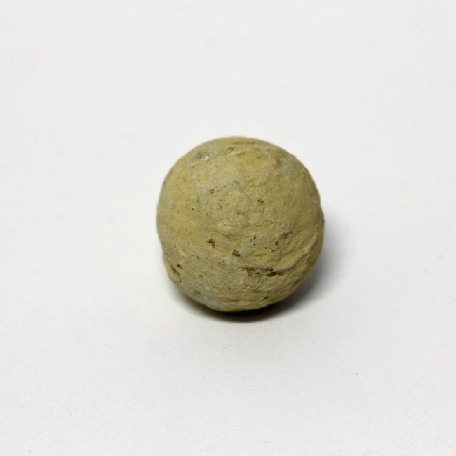 Pieza de forma esférica y de color crema con tonos beiges varios sectores. La superficie se aprecia rugosa e irregular, con algunos puntos erosionados.