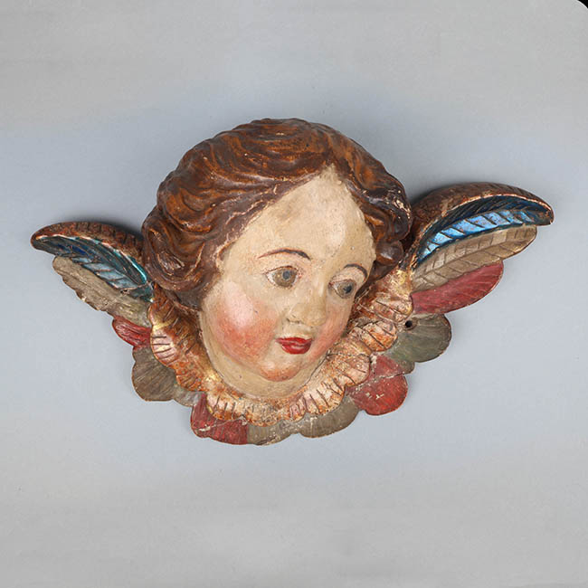 Cabeza de niño cuya mirada está dirigida hacia arriba, tiene ojos de color azul, cabello castaño ondulado. En el borde del cuello nacen un par de alas de color azúl, café, rojo y verde.
