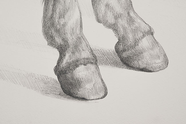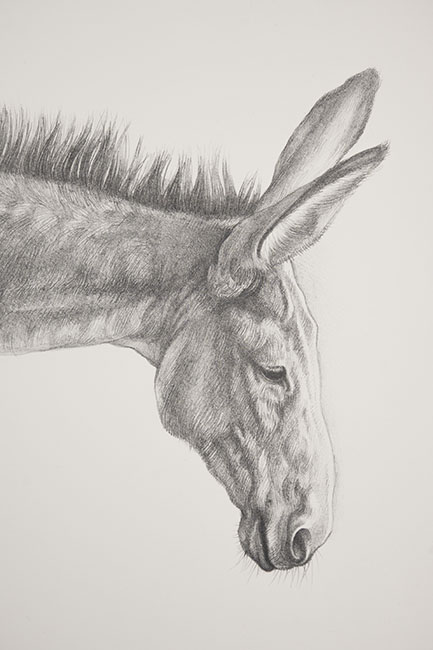Composición rectangular apaisada. Representación de cuerpo completo de un burro en posición lateral , orientado hacia la derecha, en escala de grises. El animal se encuentra de pie, con la cabeza levemente descendida y las orejas erguidas. La figura ocupa casi la totalidad del plano horizontal, destacando su anatomía mediante un detallado estudio de volumen y textura que da cuenta de la musculatura y los pliegues de la piel de un ejemplar desnutrido. El fondo carece de elementos contextuales, lo que centra la atención exclusivamente en la figura del animal. Se aprecian leves sombras proyectadas bajo las patas, que aportan anclaje espacial.