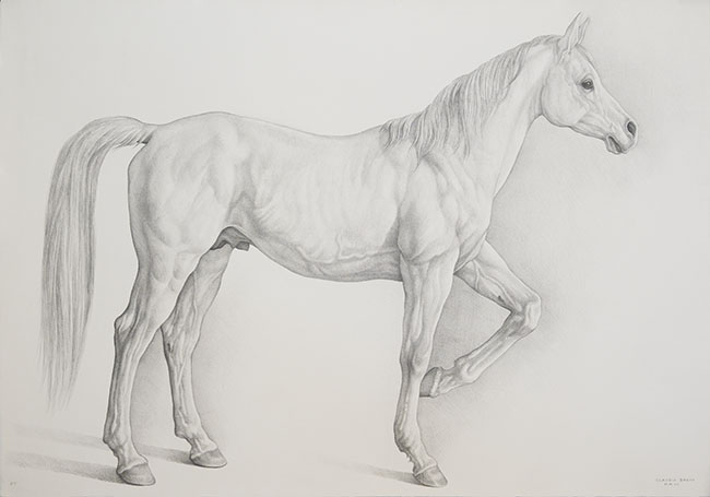 Composición rectangular apaisada. Representación de un caballo de cuerpo completo en posición lateral, orientado hacia la derecha, en escala de grises. El animal se encuentra de pie, con la cabeza y las orejas erguidas, en actitud de marcha, con una de sus patas delanteras flectada.