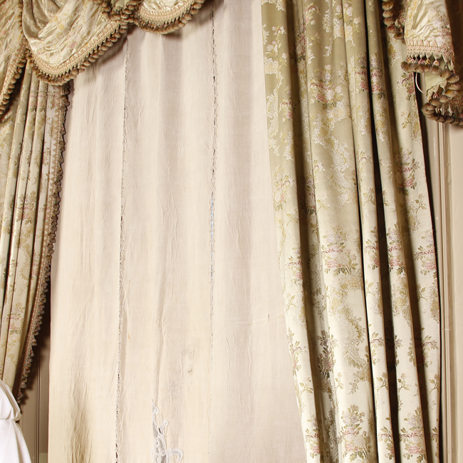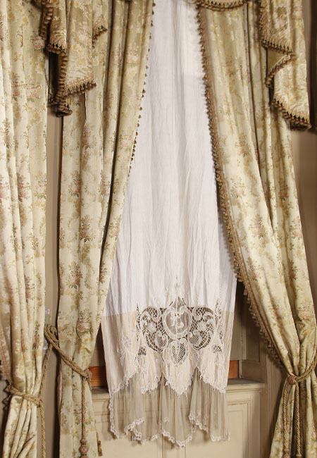 Cortinas laterales de tela gruesa con diseño floran en tonos dorados, recogidas en amarras. Al centro visillo blanco semitransparente con encaje inferior decorativo.