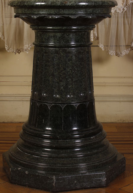 Plinto de piedra oscura pulida, de sección circular con base poligonal escalonada. Fuste troncocónico con molduras anulares y banda decorativa de arcos. Parte superior ensanchada.