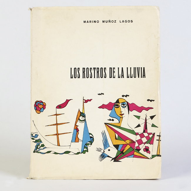 Libro de formato rectangular, compuesto por un conjunto de hojas con textos regulares, encuadernadas mediante un lomo. Presenta cubiertas rígidas, donde se lee el título: “Los rostros de la lluvia"