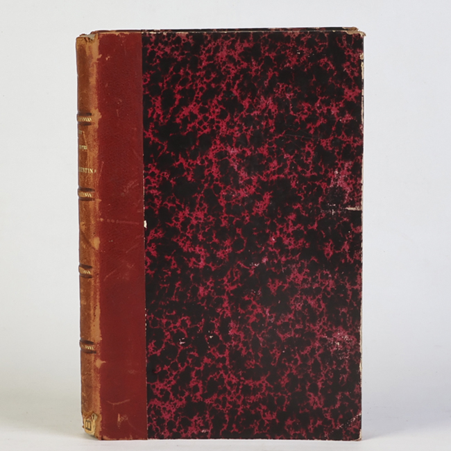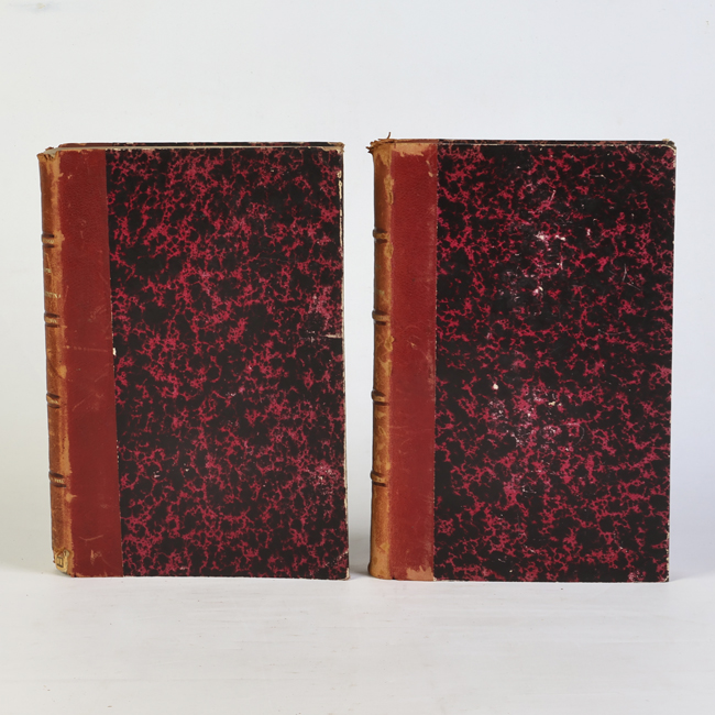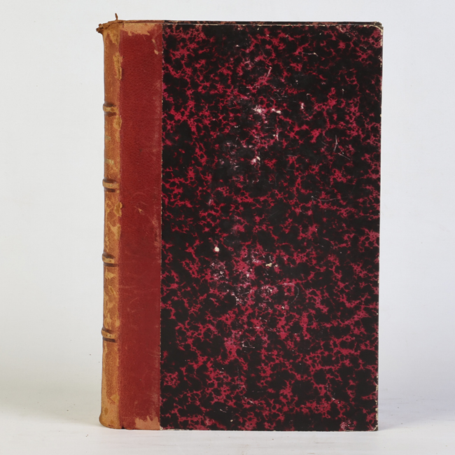 Libros de formato rectangular, con tapas duras. Las cubiertas presentan un diseño marmoleado en tonos rojo oscuro y negro. Los lomos y las esquinas están reforzados con cuero marrón. No se observan inscripciones ni ilustraciones en las portadas.
