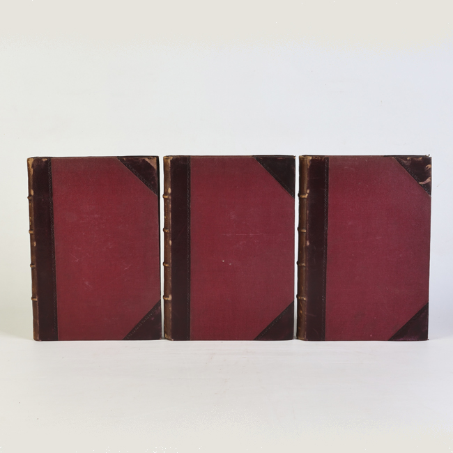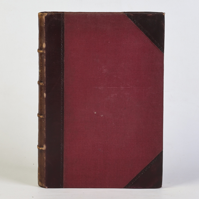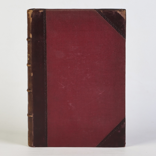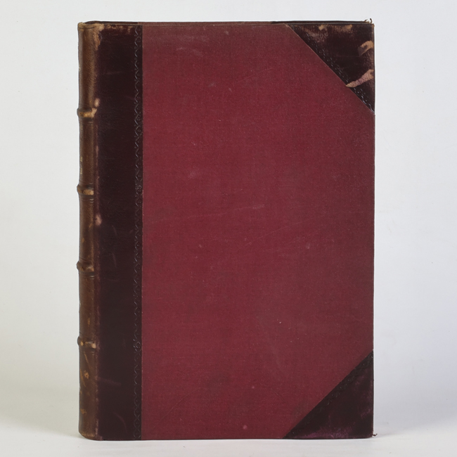 Libros de formato rectangular, con tapas duras. Las cubiertas presentan tonos rojo oscuro. Los lomos y las esquinas están reforzados con cuero marrón. No se observan inscripciones ni ilustraciones en las portadas.