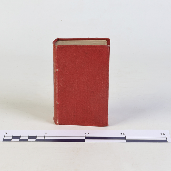 Libro de portadas en color rojo, de formato rectangular, compuesto por un conjunto de hojas con textos regulares, dispuestas en conjunto y unidas mediante encuadernación en lomo.