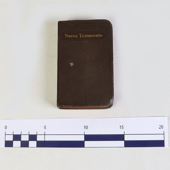 Libro de formato rectangular, compuesto por un conjunto de hojas con textos regulares, encuadernadas mediante un lomo. Presenta cubiertas rígidas, donde se lee el título: “ Nuevo testamento".