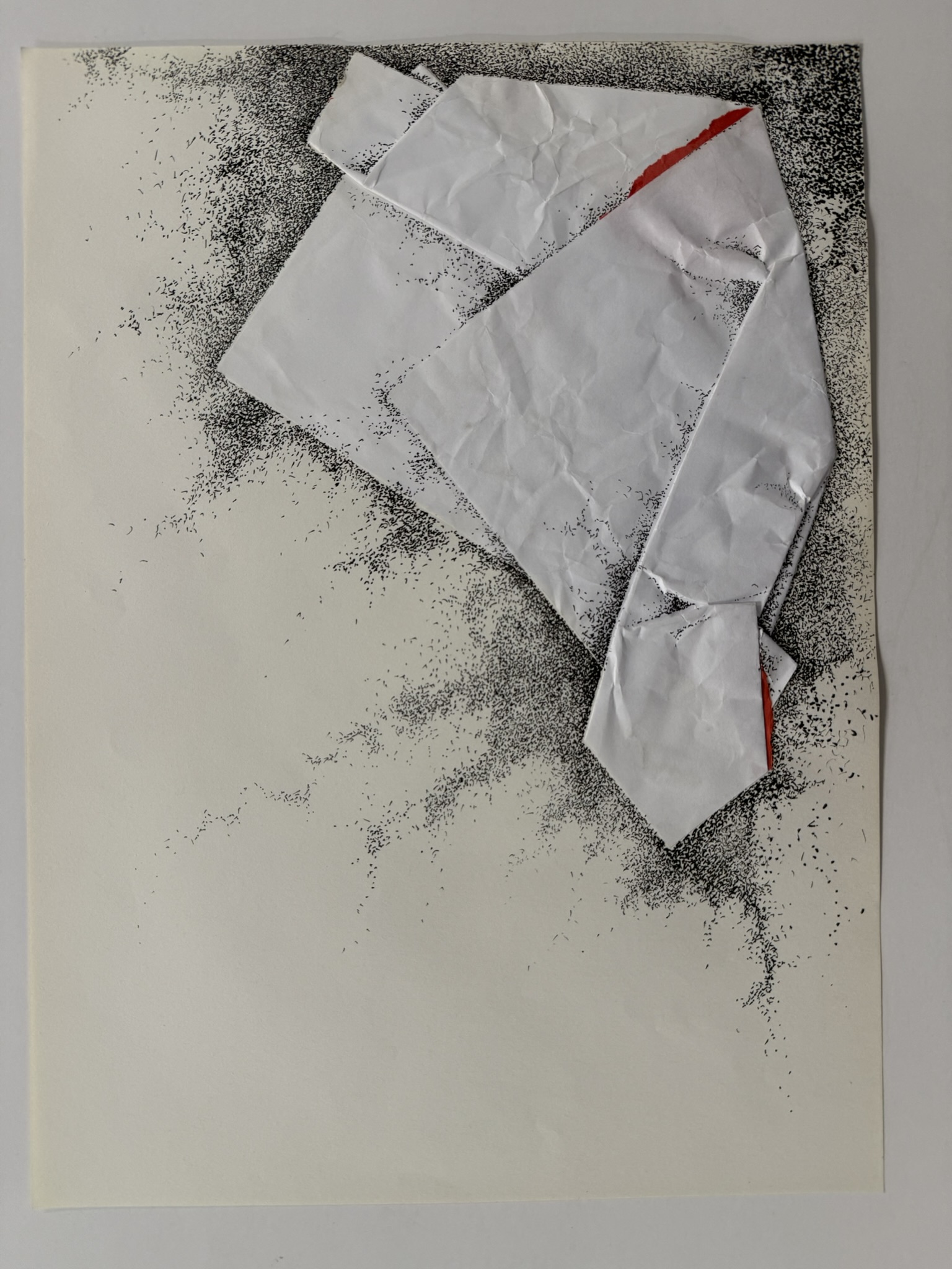 Obra de formato rectangular y orientación horizontal. Composición asbtracta en base a papel plegado en la esquina superior derecha con detalles rojos. Rodeando este elemento hay pequeños puntos negros.