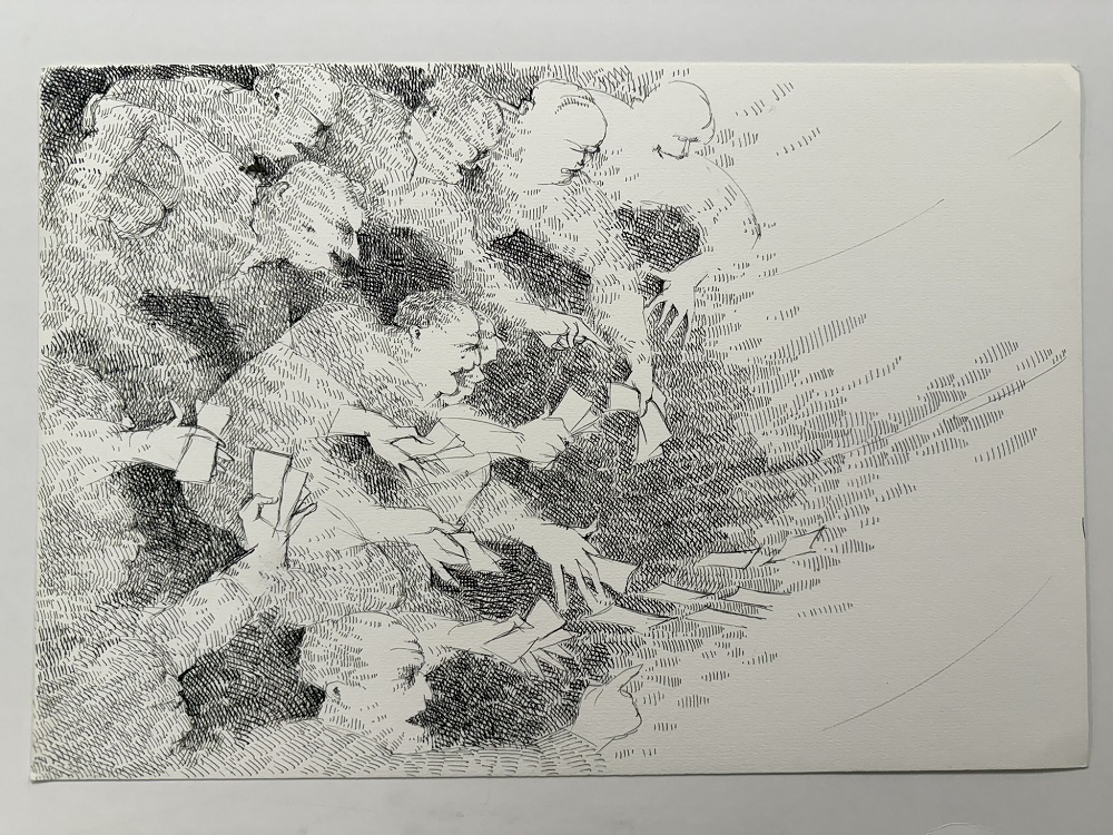 Obra de formato rectangular y orientación horizontal. Composición en base a grupo de figuras humanas ubicadas al costado izquierdo de la obra. Tienen en las manos hojas de papel que lanzan hacia el costado derecho. Algunos rostros se desdibujan quedando solo en estado de boceto. El fondo es blanco y el grupo está realizado a partir de líneas entrecruzadas en diversas direcciones, lo que le otorga a la obra variaciones de grises.