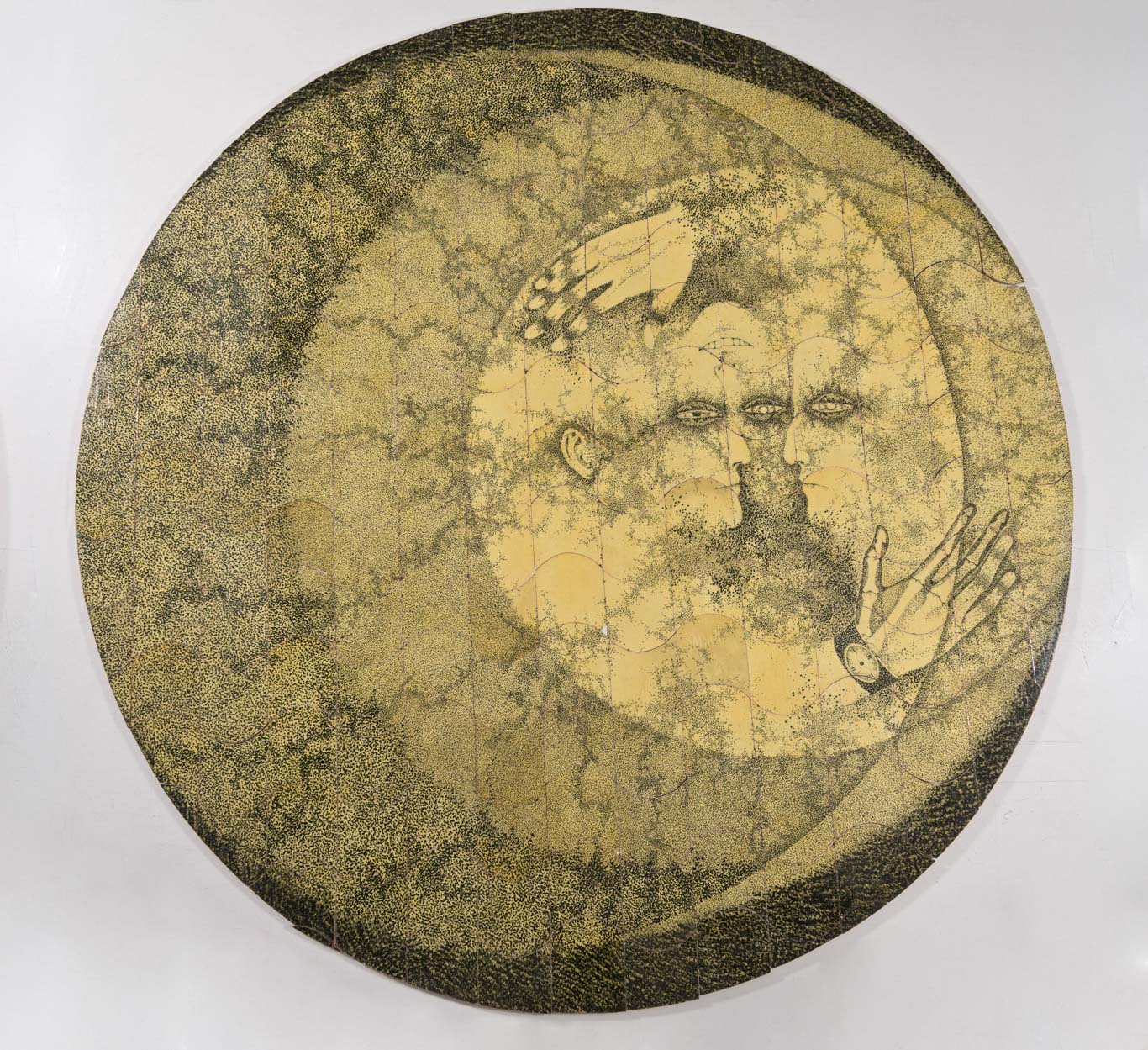 Obra de formato circular. Composición en base a tres rostros humanos concentrados en el costado derecho de la obra. Los rostros se encuentran circundados por dos manos, una de ellas con un reloj en la muñeca.