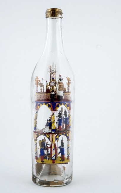 Objeto decorativo y de devoción religiosa cristiana; es una botella de vidrio y en su interior presenta una serie de figuras que representan a Cristo crucificado; al centro de esta composición destaca una cruz de madera negra con la figura de Cristo; presenta la inscripción, manuscrita, que se lee -pasión y muerte de Jesús-.