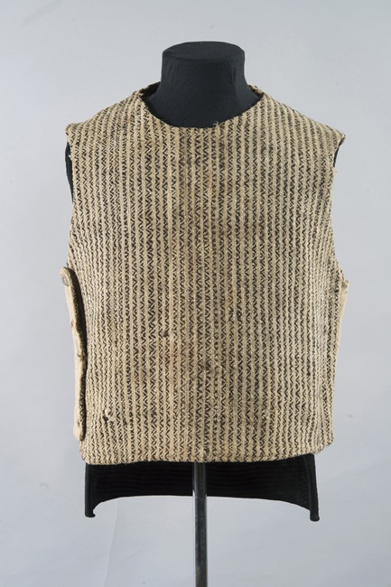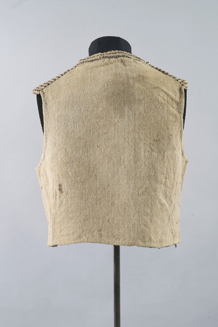 Prenda de vestir sin mangas, corte recto y escote redondo. Confeccionado a mano y tejido a telar, formando un diseño bicolor (beige y café oscuro) de listas verticales con espigas quebradas.