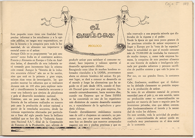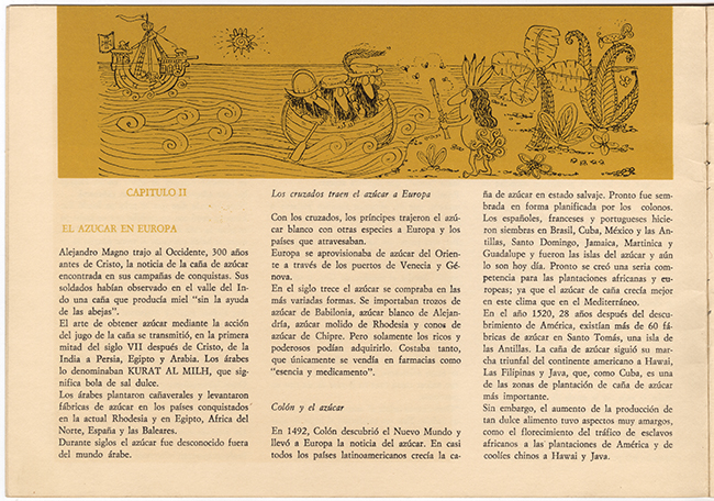 Documentación hace presentación de investigación histórica. Objeto de forma rectangular en formato horizontal. Encuadernación de tapas y lomo de cartón impresas. Hojas de papel impreso. En anverso se observa ilustración de Oski. Aoarece una remolacha en la cima de una montaña de azúcar. En interior se presentan textos, acompañados de ilustraciones y gráficos, dando un perfil histórico del azúcar.
