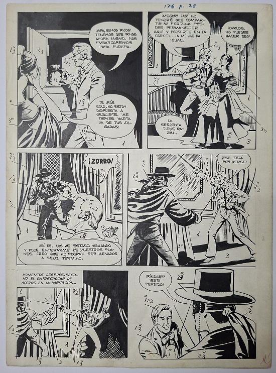 Obra visual de formato rectangular y disposición vertical. Dibujo monocromo. Está compuesto por seis viñetas protagonizadas por varias figuras masculinas y una femenina. Alrededor de algunas formas tiene diferentes números para indicar o sugerir colores.
