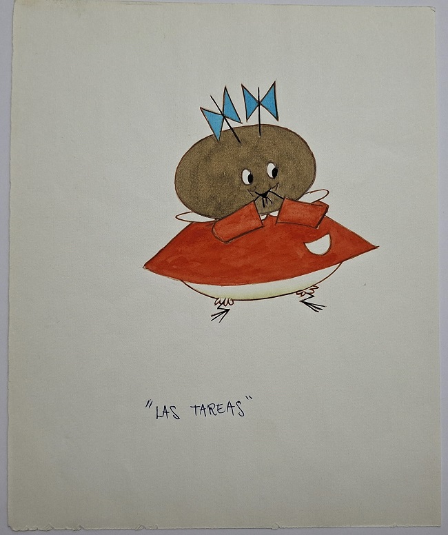 Obra visual de formato rectangular y disposición vertical. Dibujo policromado. En el centro de la composición se ubica una figura antropomorfa de cabeza oval oscura, viste un traje rojo. Debajo, un título manuscrito que dice: “Las tareas”.