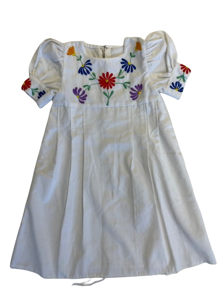 Vestido de niña color blanco, con manga corta y bordados de flores en el canesú y en el borde de las mangas, estas son un poco englobadas y terminan en una pretina también bordada con los mismos motivos bordados. Las flores son azules, moradas, naranjas y rojas con centro amarillo t tallos y hojas color verde. Tiene el cuello redondo y corte imperio. En el delantero la falda tiene 3 tablas en cada costado. Se abrocha con cierre metálico.