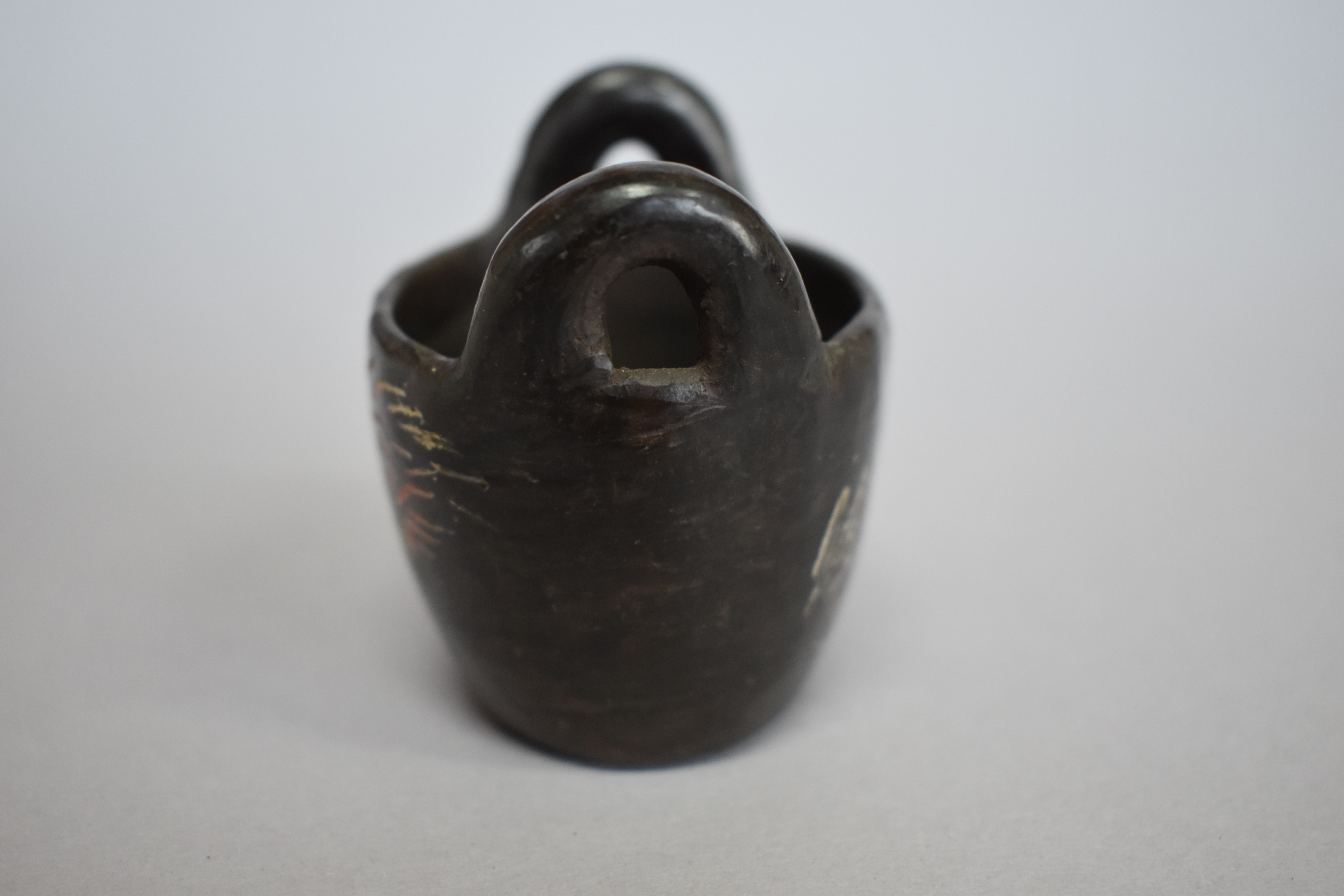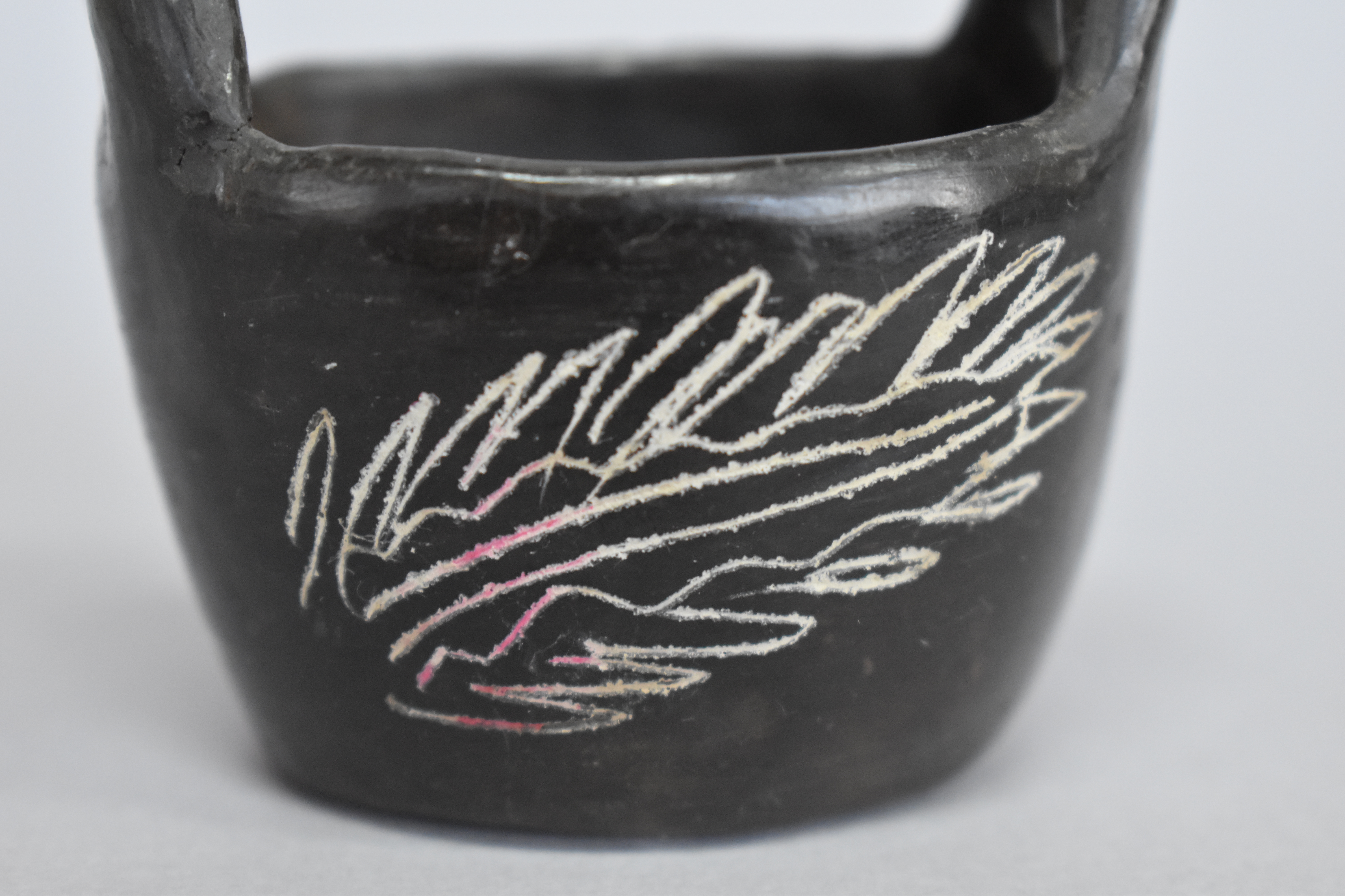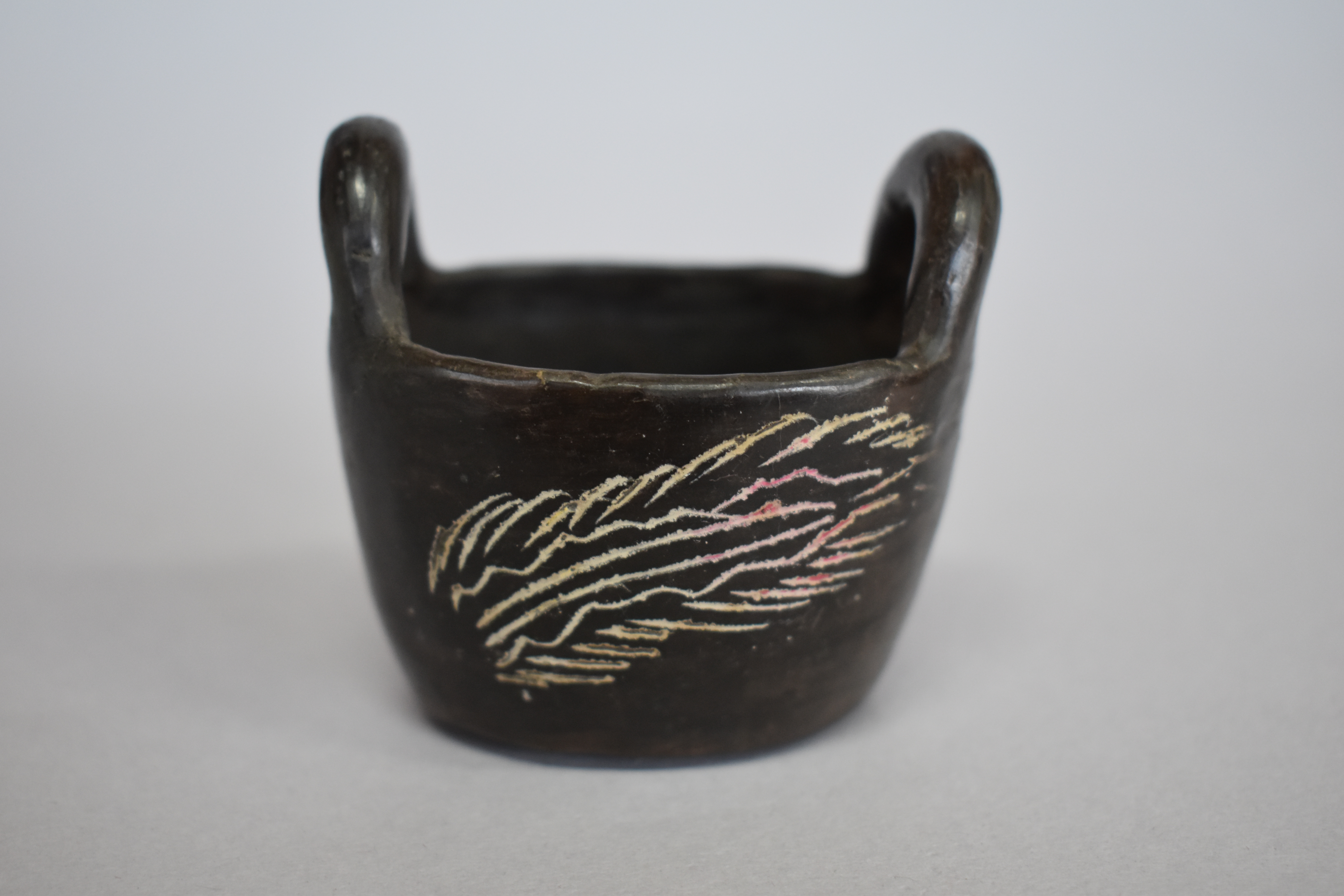 Objeto decorativo. Recipiente de greda de superficie bruñida, engobada color negro en el exterior, compuesto por un cuerpo cóncavo de base ovalada plana y paredes elevadas, de borde redondeado, sobre este se posan dos asas horizontales curvas. Se encuentra decorado en dos de sus caras con incisos lineales y curvos en diagonal que encierran dos líneas irregulares y dos líneas rectas en diagonal, formando un diseño fitomorfo en color blanco.