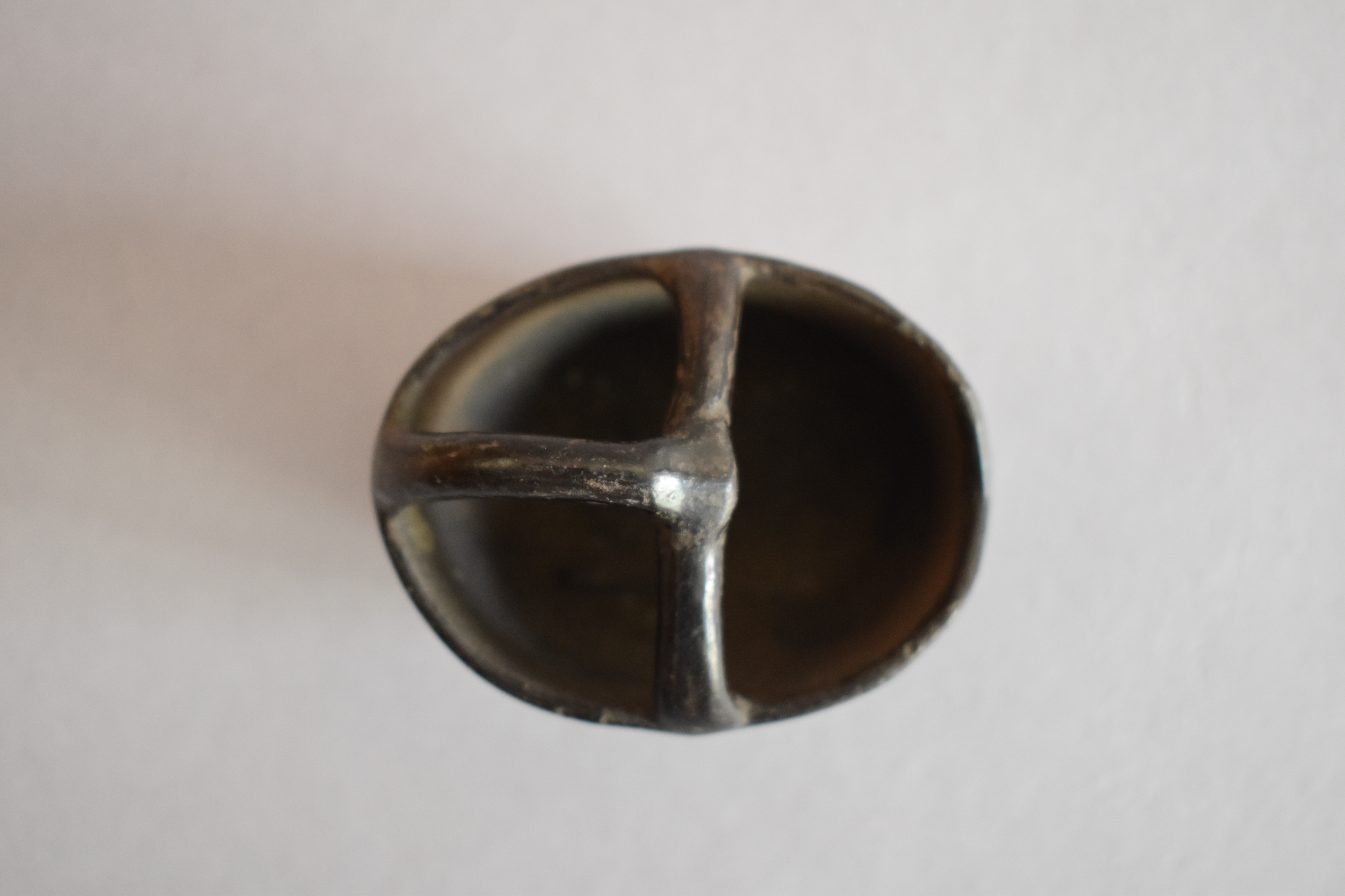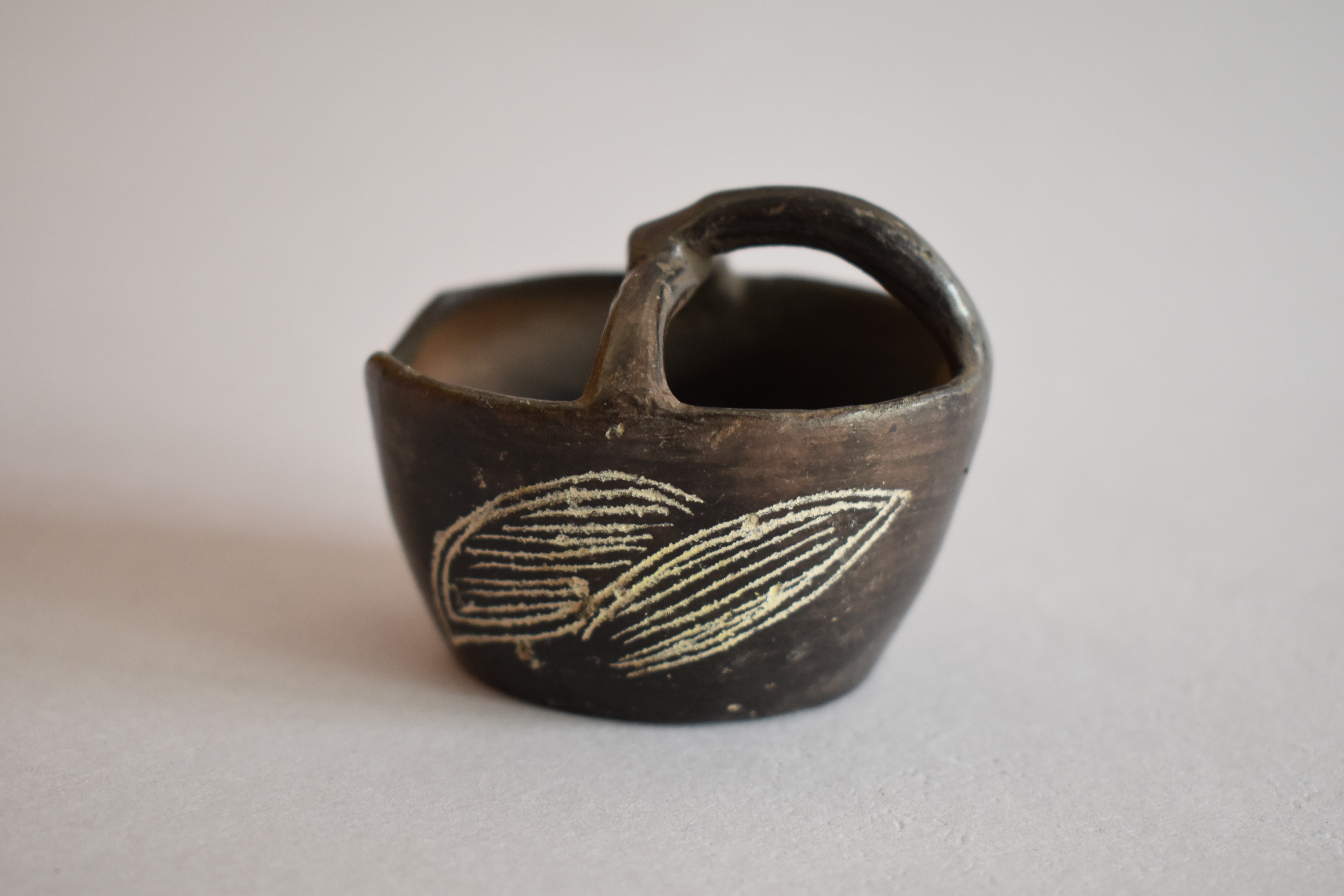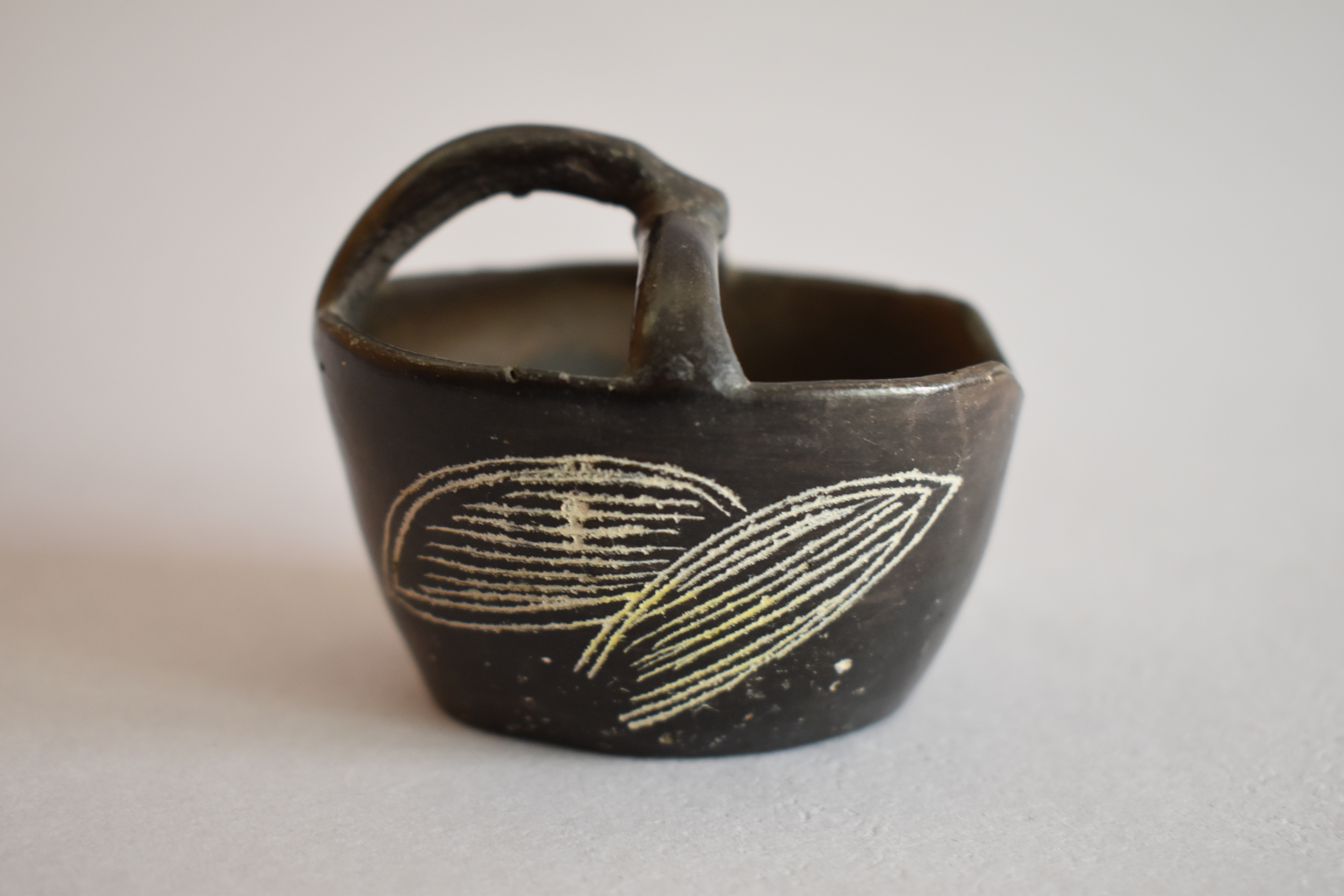 Objeto decorativo. Recipiente de greda de superficie bruñida, engobada color negro en el exterior, compuesto por un cuerpo cóncavo de base ovalada plana y paredes elevadas, de borde redondeado. Posee un asa puente que une dos lados de la pieza y de la parte central de esta se posa otra asa que se une a un extremo del cuerpo. Se encuentra decorado en dos de sus paredes con incisos lineales y curvos en diagonal, formando un diseño fitomorfo en color blanco.