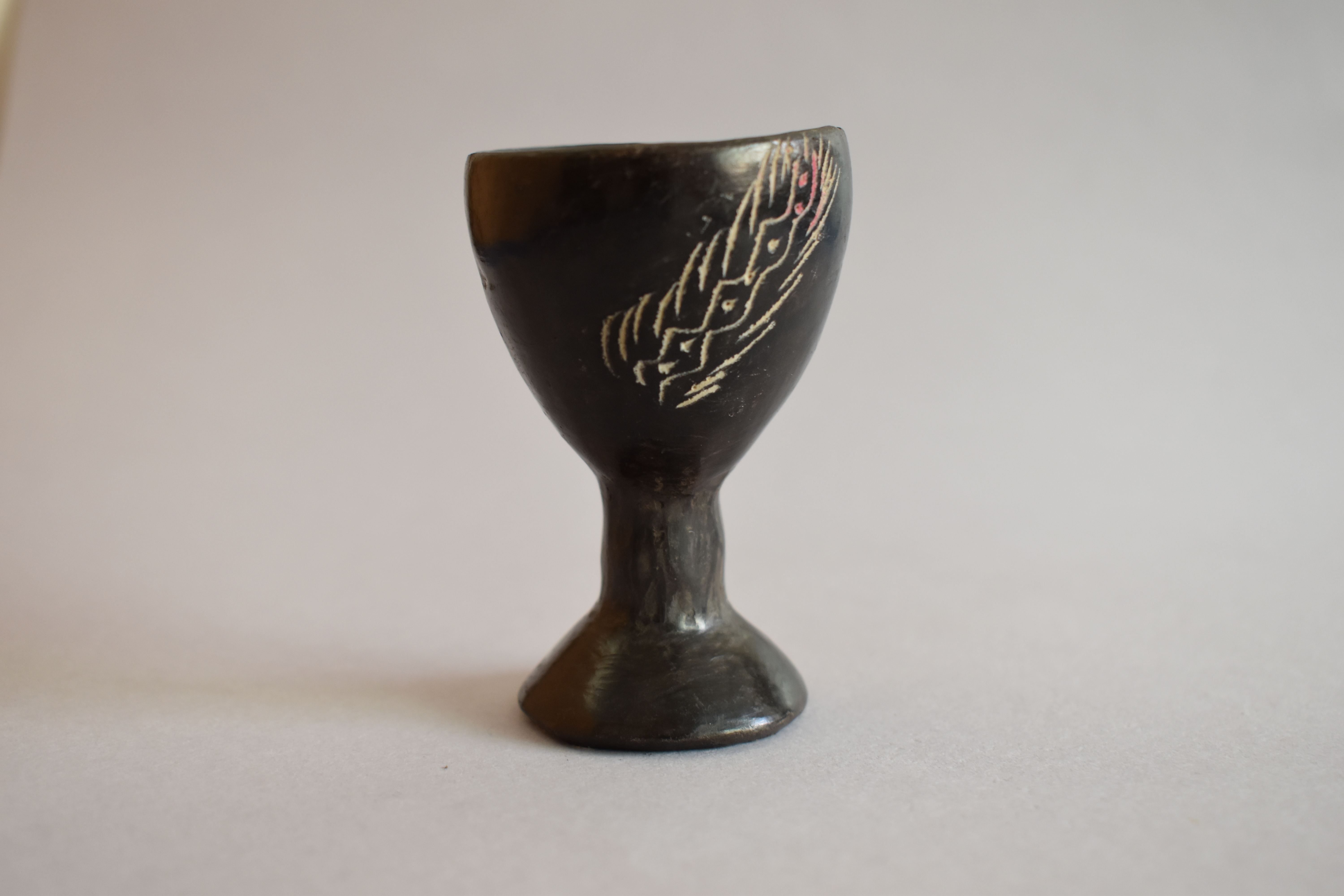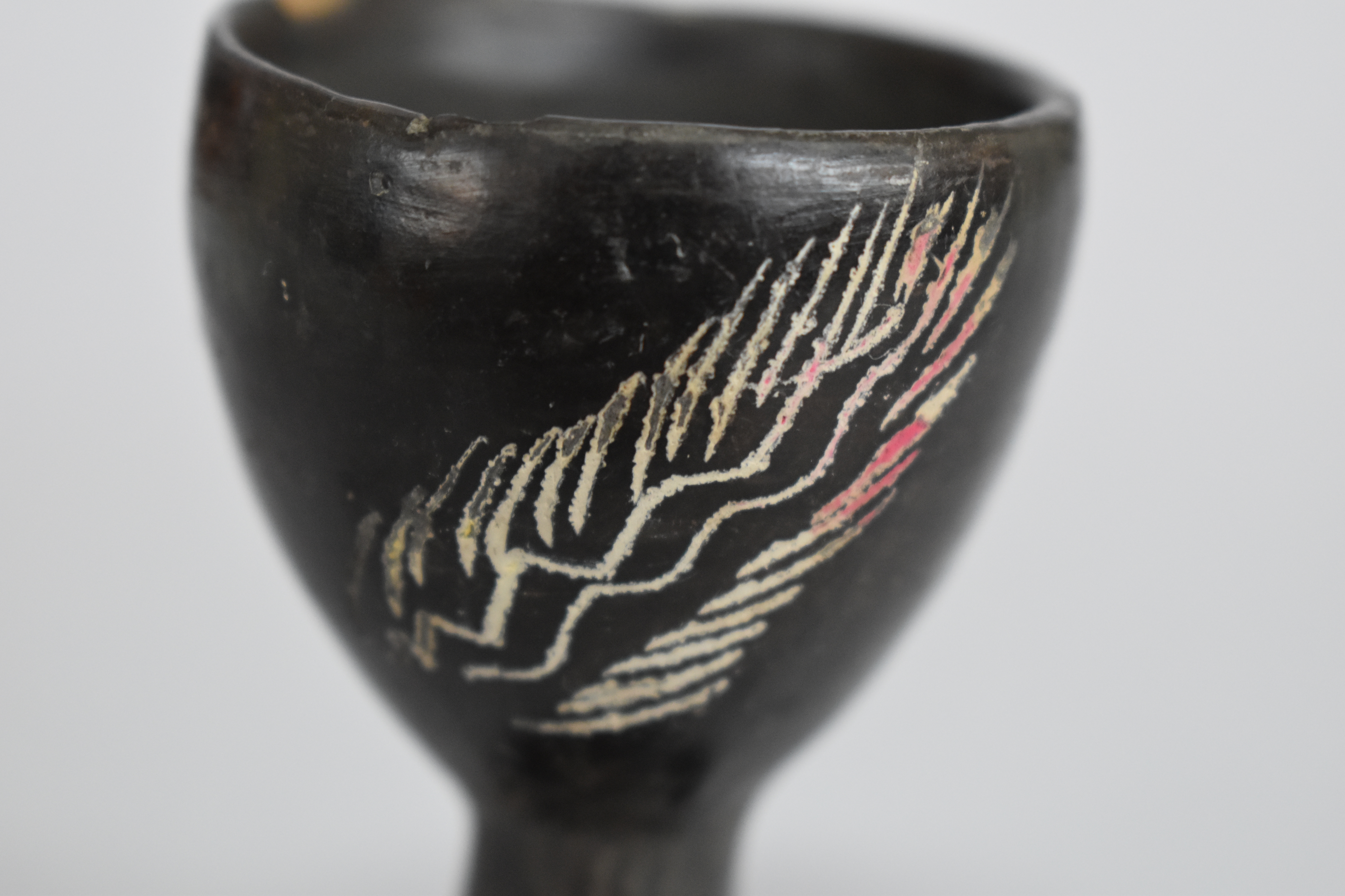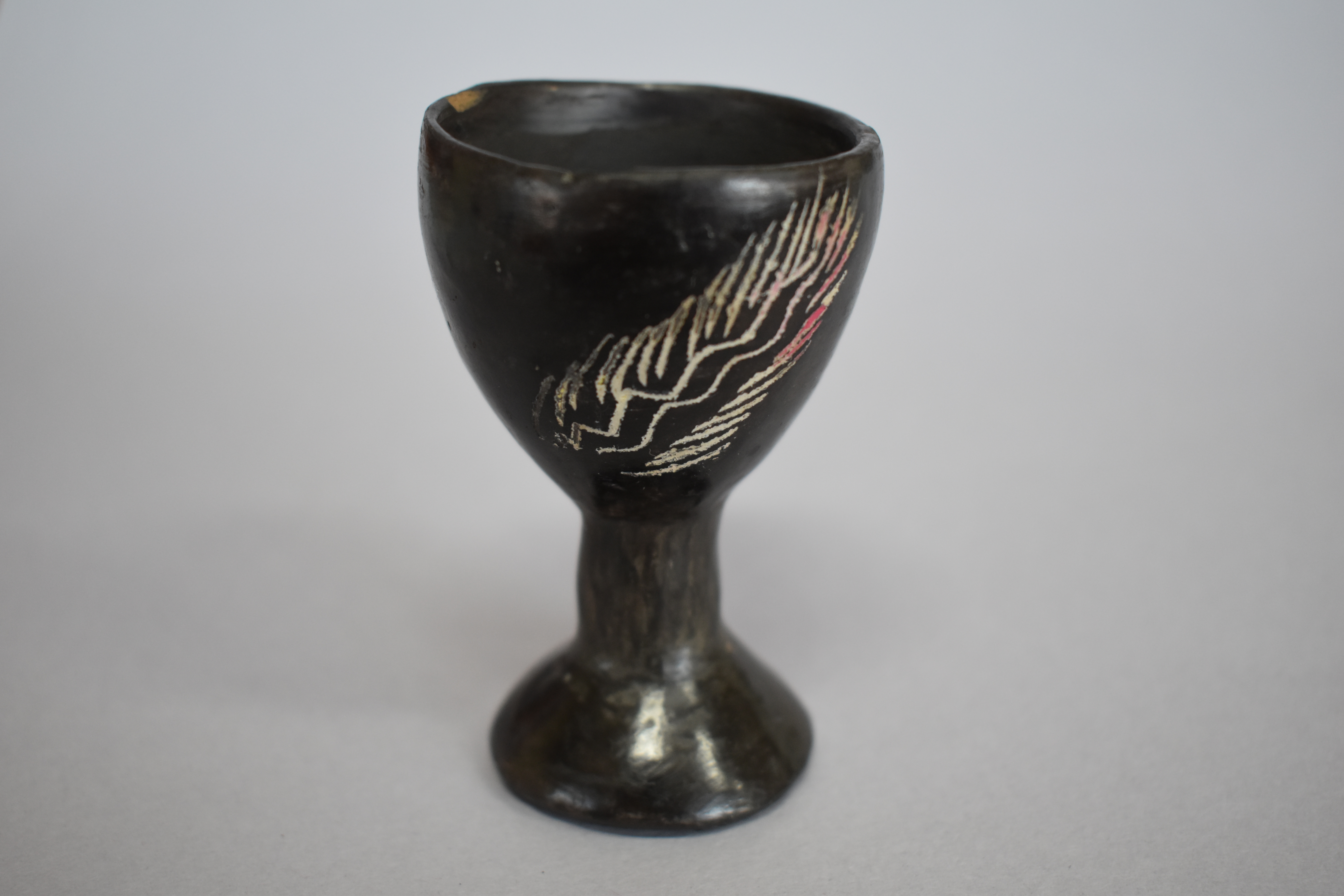 Objeto decorativo. Recipiente de greda de superficie bruñida, engobada color negro en el exterior, de cuerpo cóncavo de paredes elevadas, con borde redondeado, posado sobre un pedestal de base circular. Se encuentra decorado en dos de sus paredes con incisos lineales y curvos en diagonal, formando un diseño fitomorfo en color blanco.