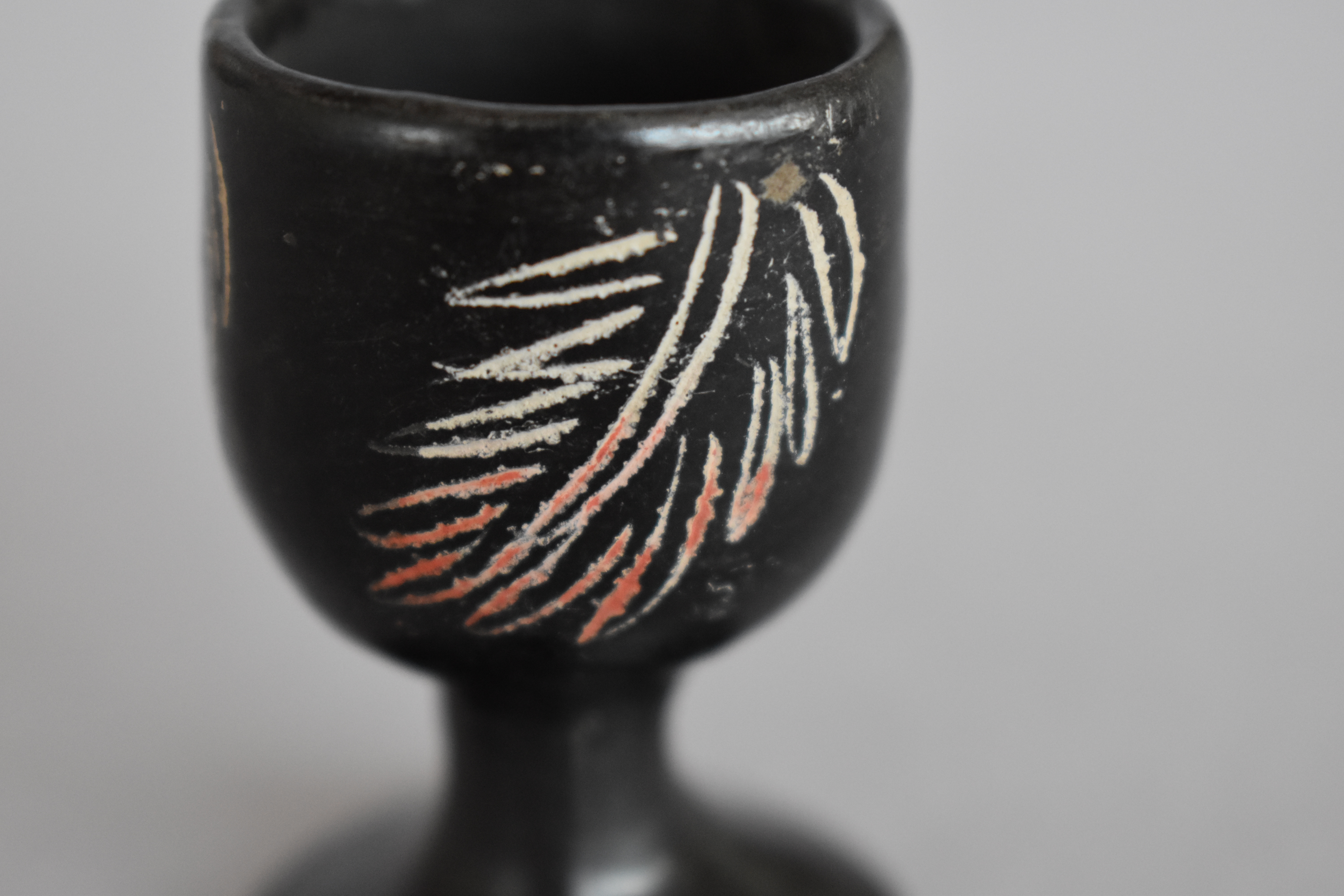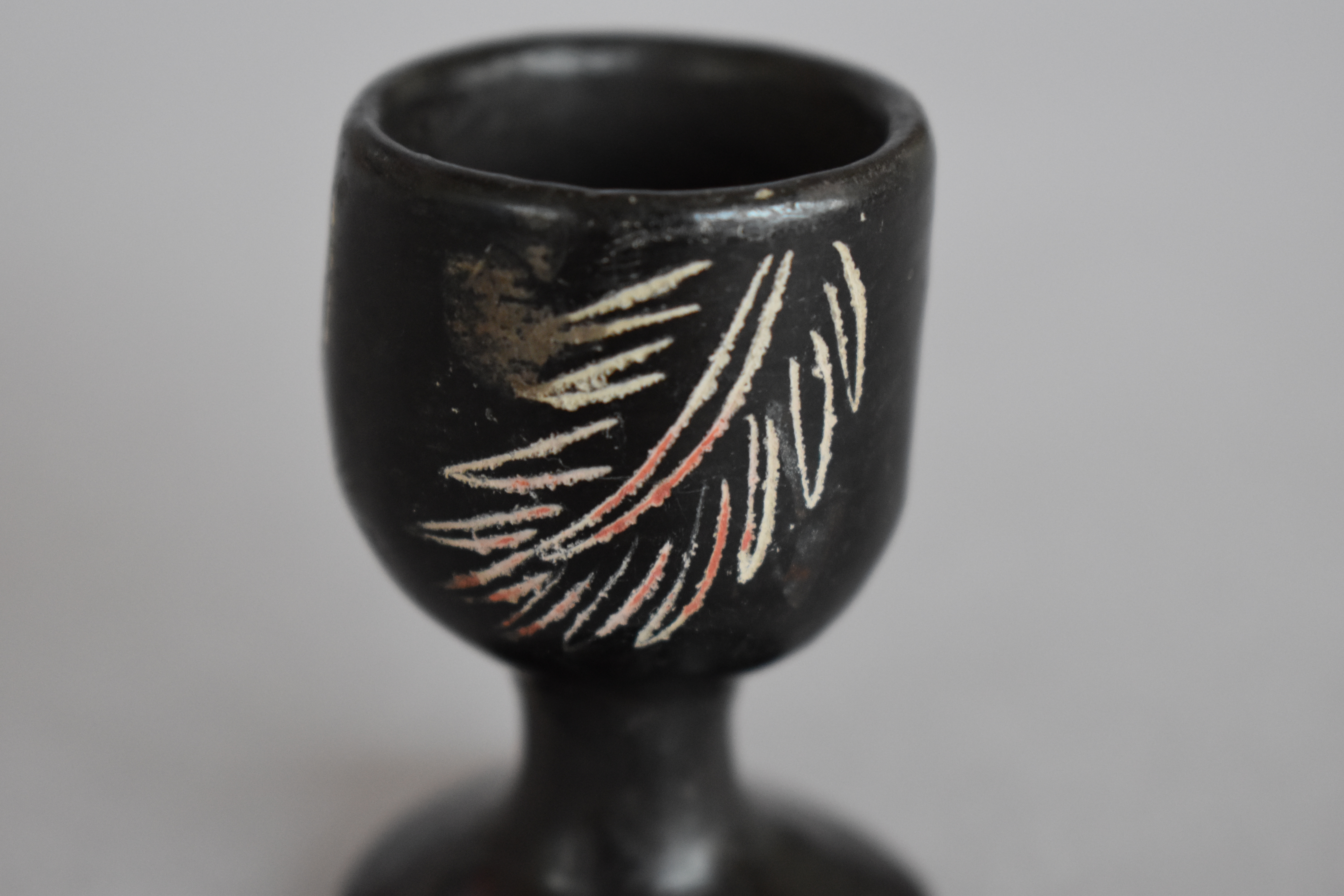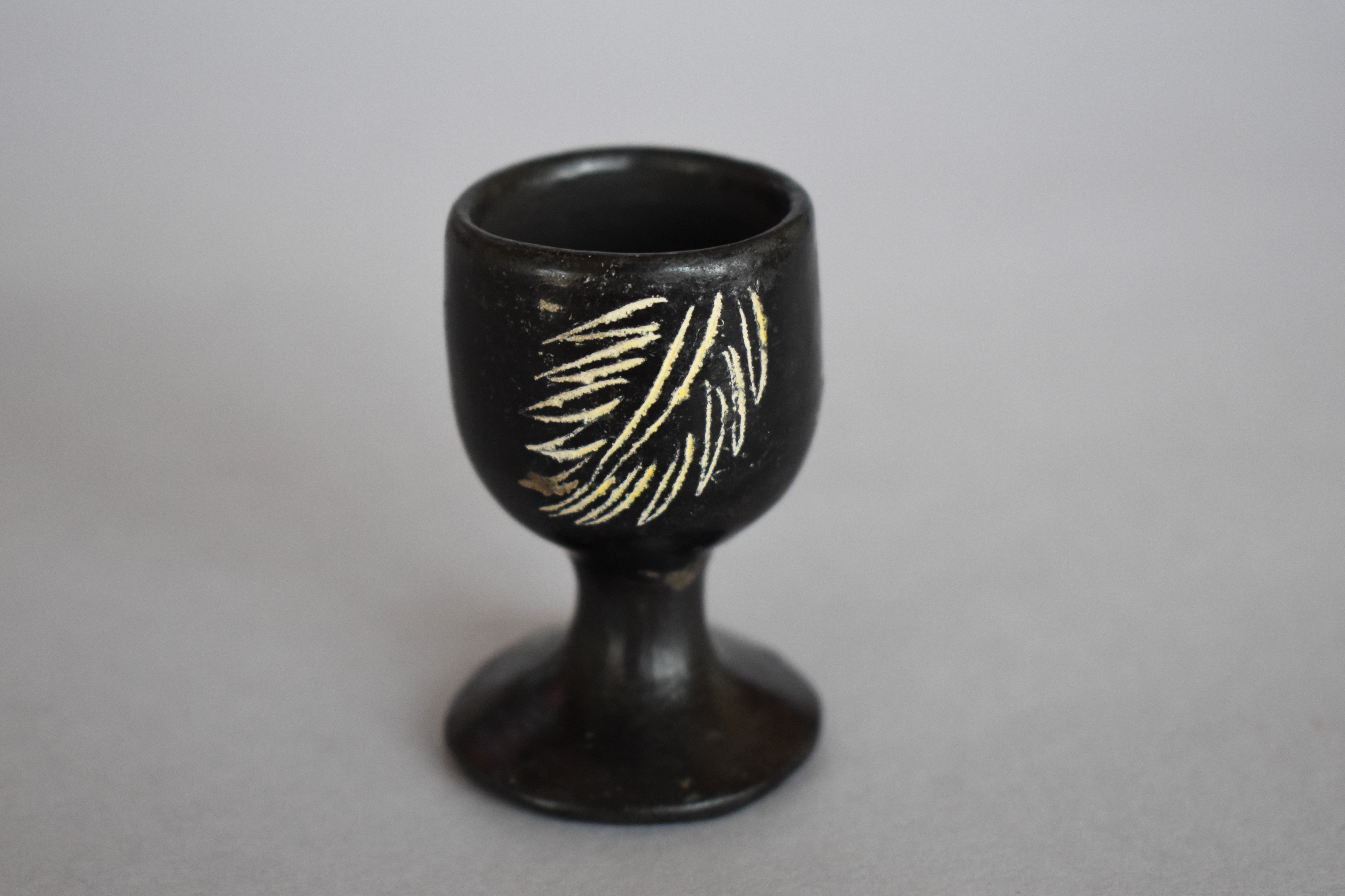 Objeto decorativo. Recipiente de greda de superficie bruñida, engobada color negro en el exterior, de cuerpo cóncavo de paredes elevadas, con borde redondeado, que se posa sobre un pedestal de base circular. Se encuentra decorado con tres grupos de incisos lineales y curvos en diagonal, formando diseños fitomorfos en color blanco.