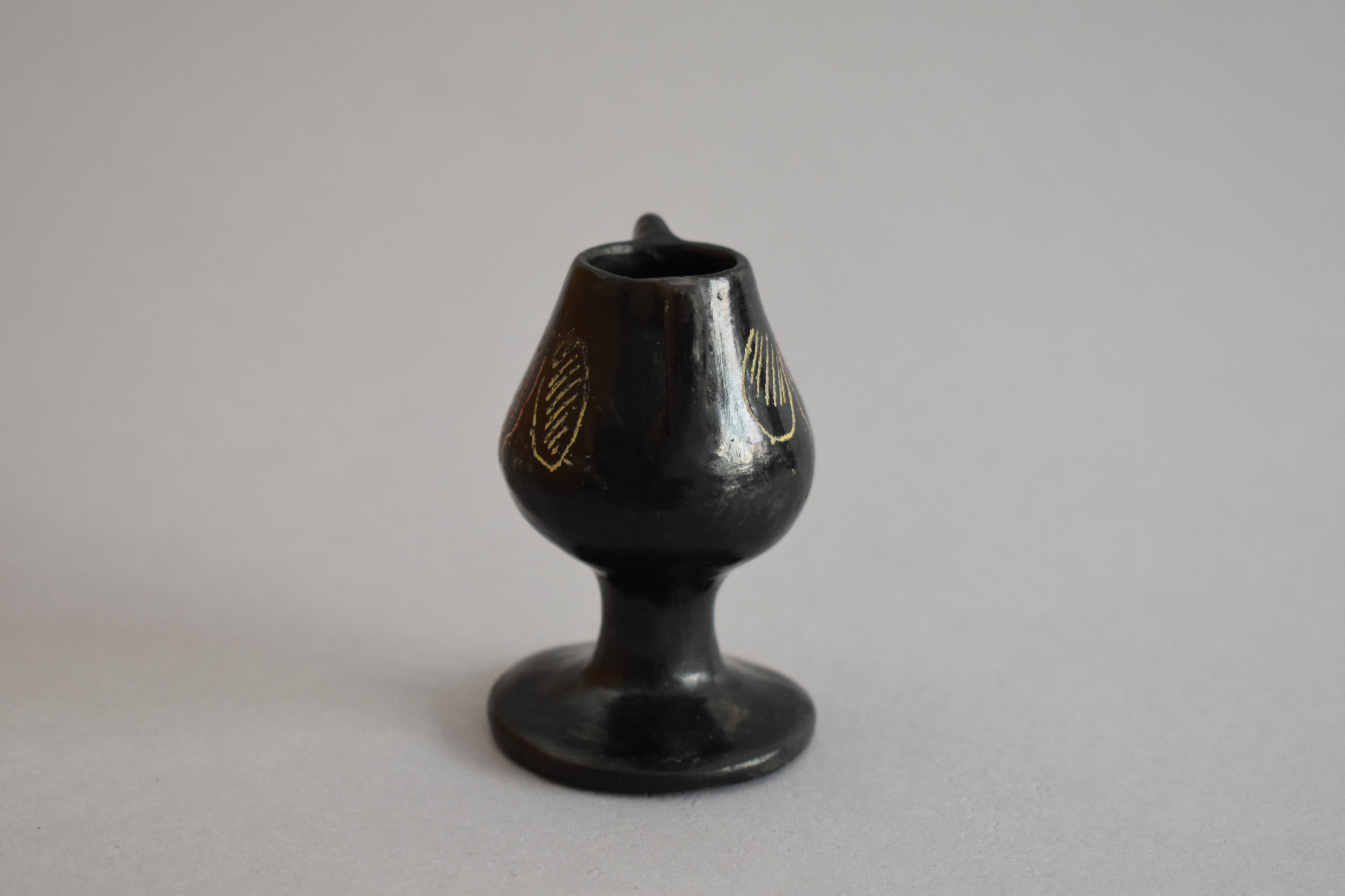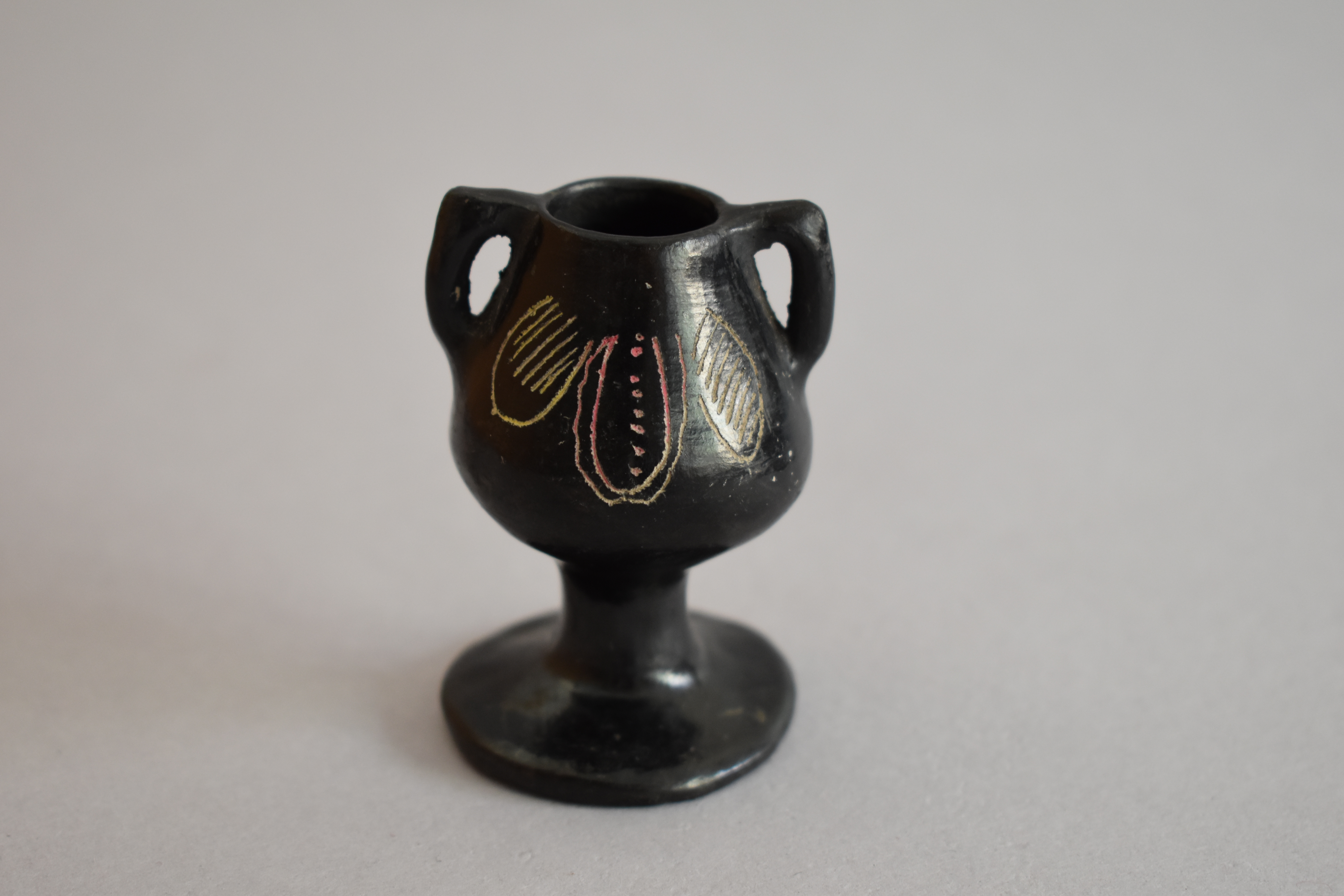 Objeto decorativo. Recipiente de greda de superficie bruñida, engobada color negro, compuesto de un cuerpo globular de borde curvo, posado sobre un pedestal de base circular. Sobre el borde salen dos asas horizontales que se unen a la porción central del cuerpo. Presenta decoración en ambas caras de líneas incisas diagonales y puntiformes que se encuentran encerradas en incisos curvos, formando un diseño fitomorfo en color blanco.