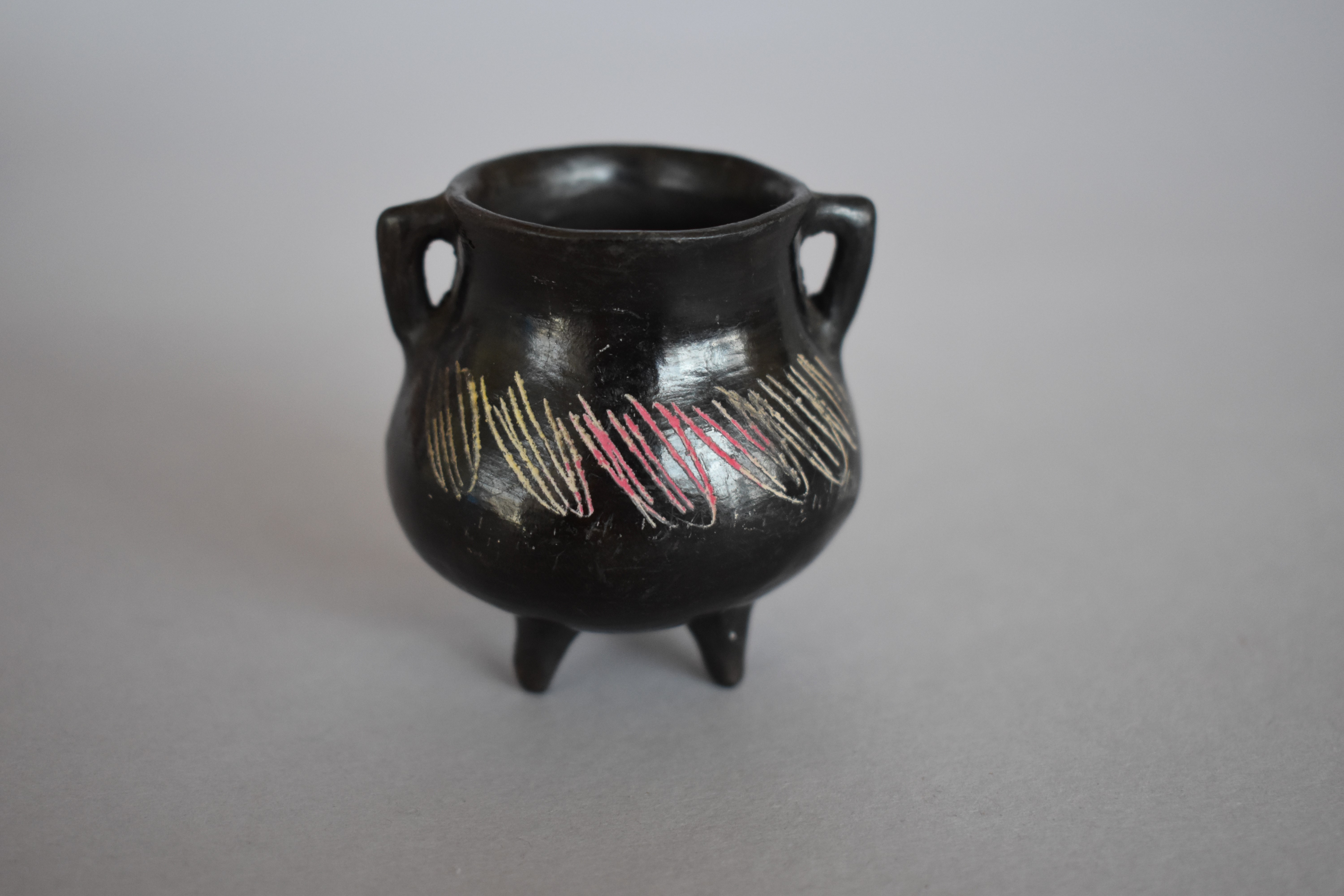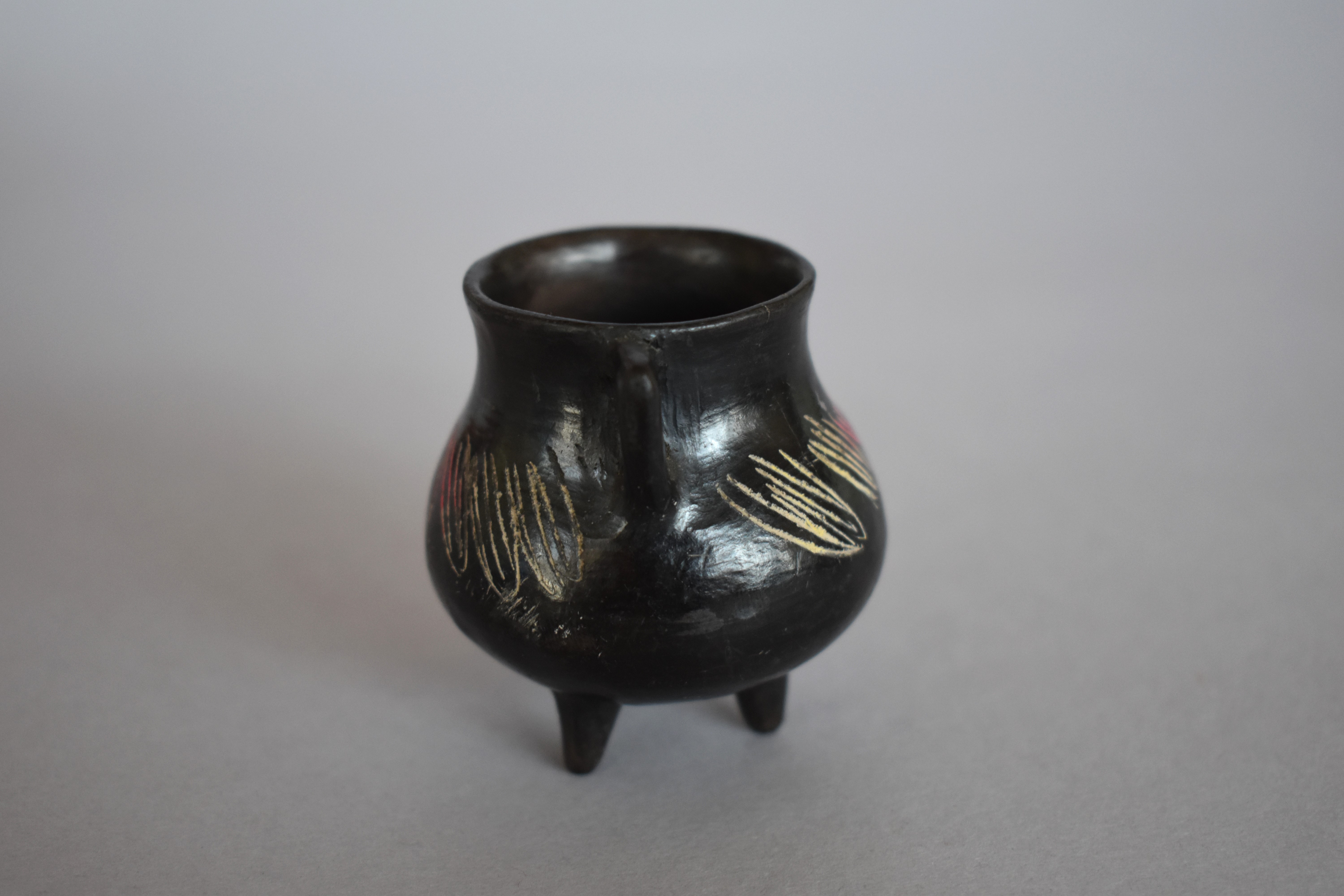 Objeto decorativo. Recipiente de greda de superficie bruñida, engobada color negro, compuesto de un cuerpo globular posado sobre una base de tres patas de extremos apuntados, con cuello ancho y corto y una boca ancha y circular. Posee dos asas verticales a los lados que salen desde el cuello y se unen a la porción central del cuerpo. Se encuentra decorado en ambas caras con grupos de incisos curvos con incisos lineales diagonales en su interior, formando un diseño en color blanco.
