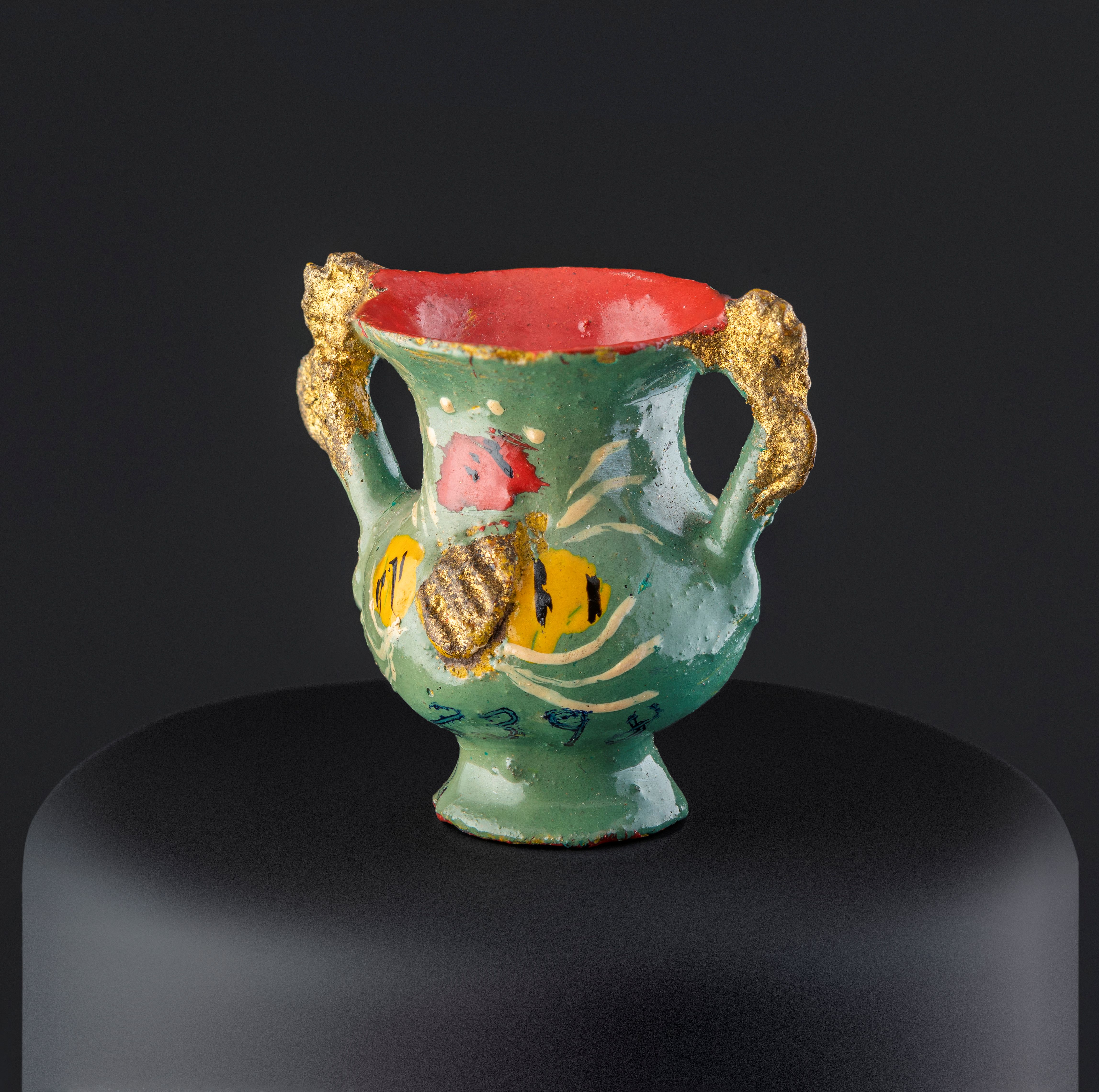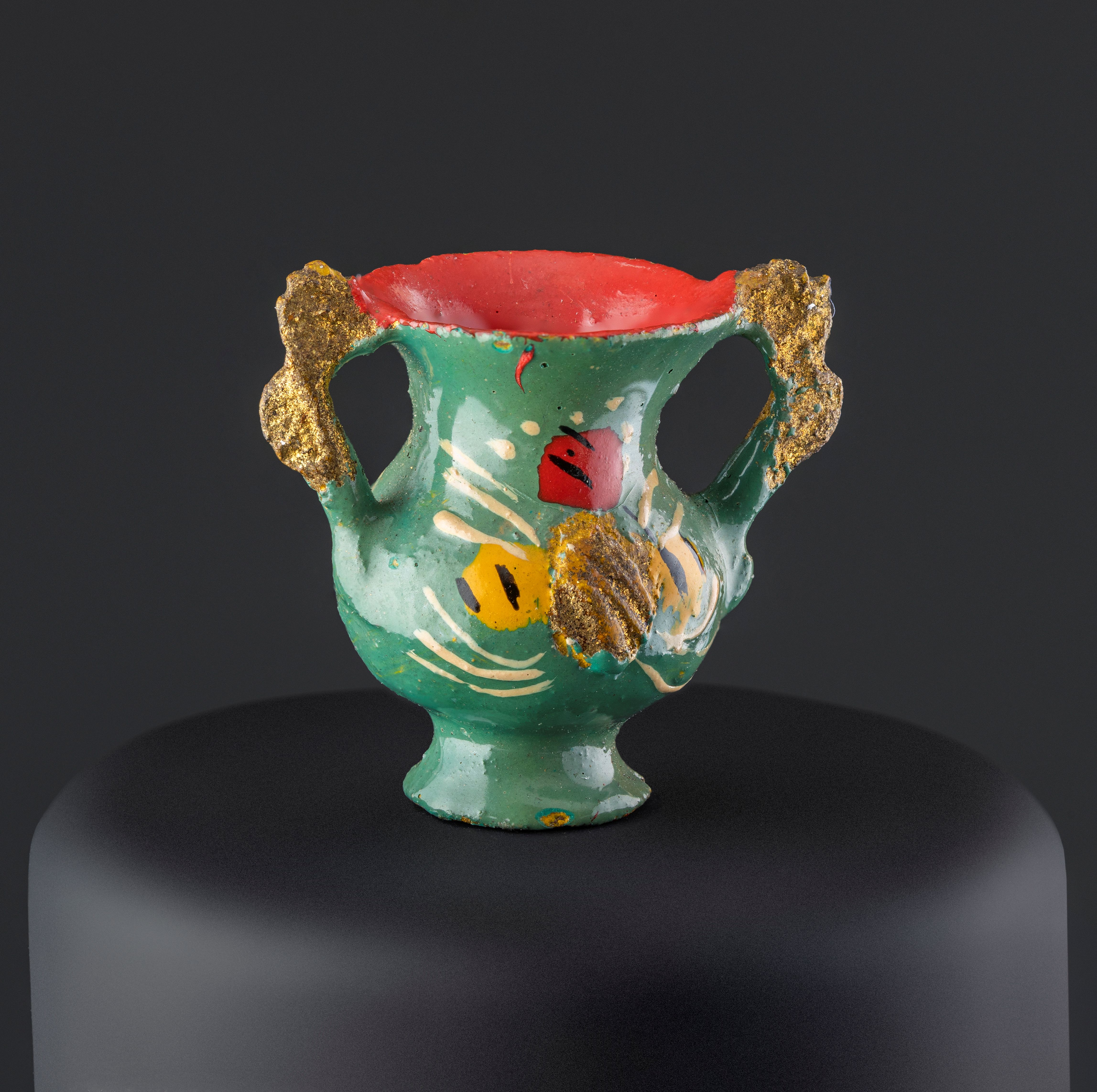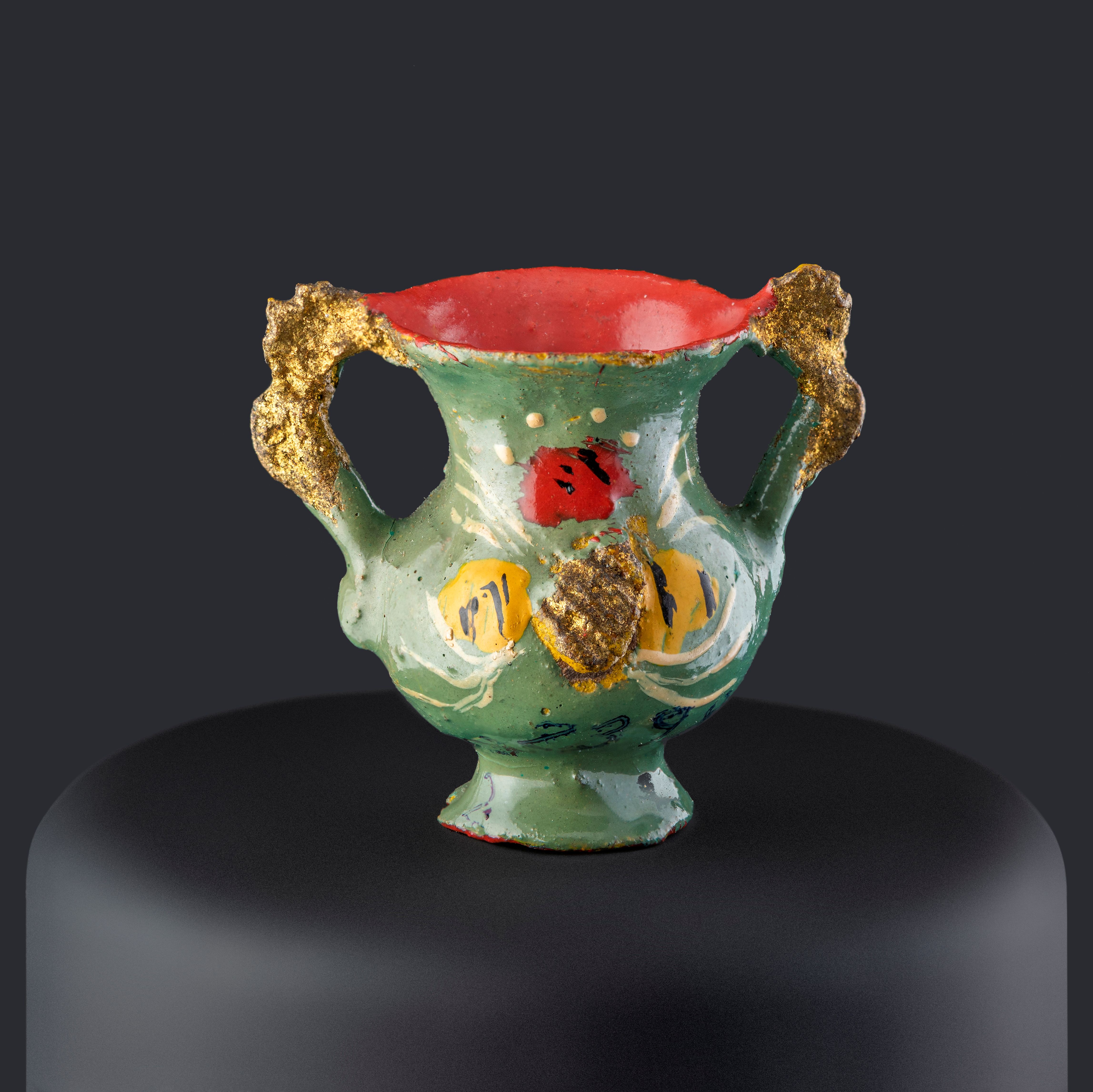 Objeto decorativo de cerámica esmaltada de color turquesa. Compuesto de un cuerpo globular que se amplía hacia el extremo superior y una base de forma circular, desde el borde superior sobresalen dos asas que se unen al cuerpo. El cuerpo por dentro y la base están pintados en color rojo y la pieza tiene decoraciones en tonos amarillo, blanco, negro, rojo y ocre.