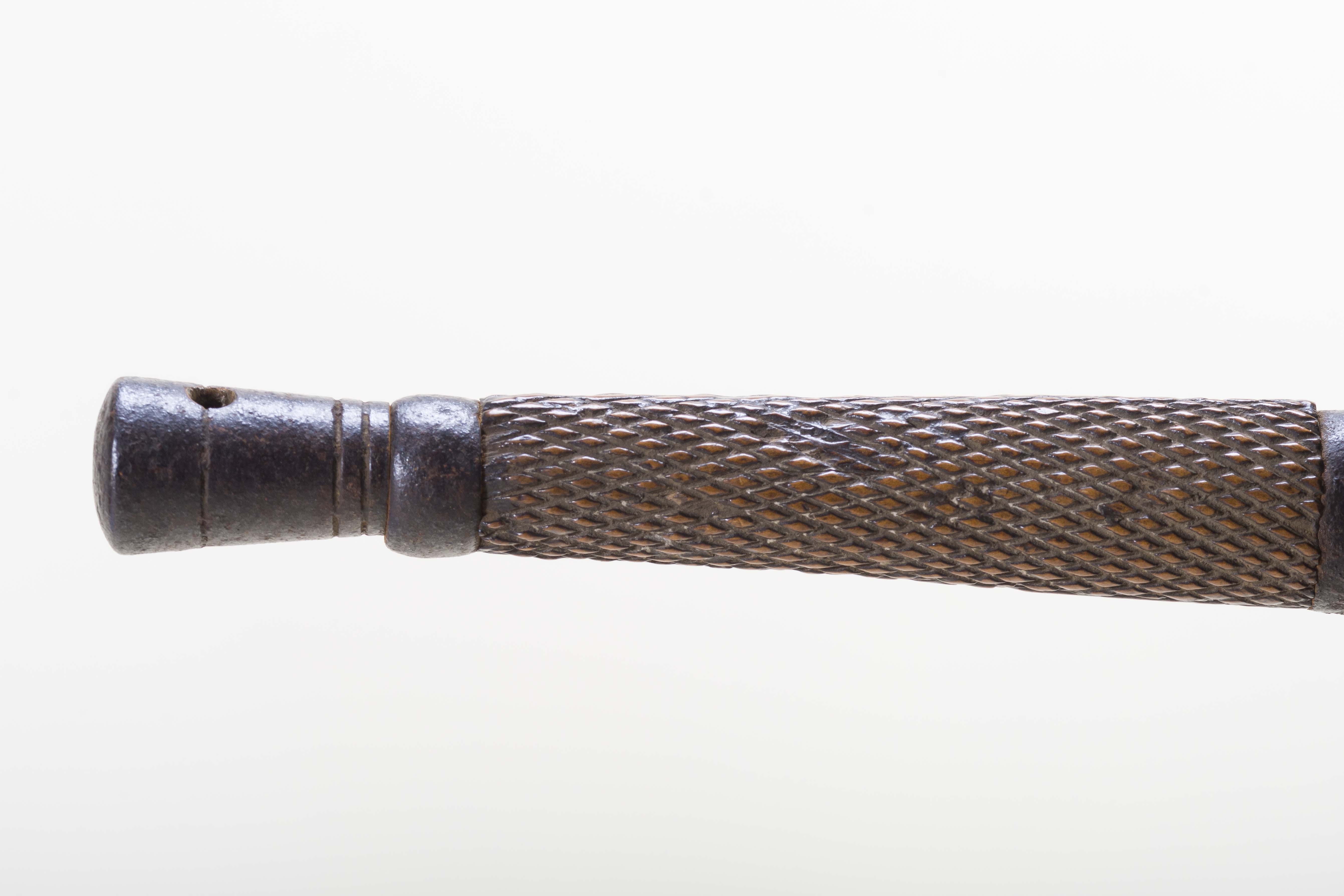 Arma blanca punzante de mano. Compuesta de empuñadura y hoja. Empuñadura constituida de pomo de fierro con un orificio, mango de madera labrado con figuras romboidales, cruz de fierro y gavilanes ascendentes hasta lunirse con a cazoleta semicircular. Hoja recta cúbica aguzada hacia el extremo superior, sin filo y punta.