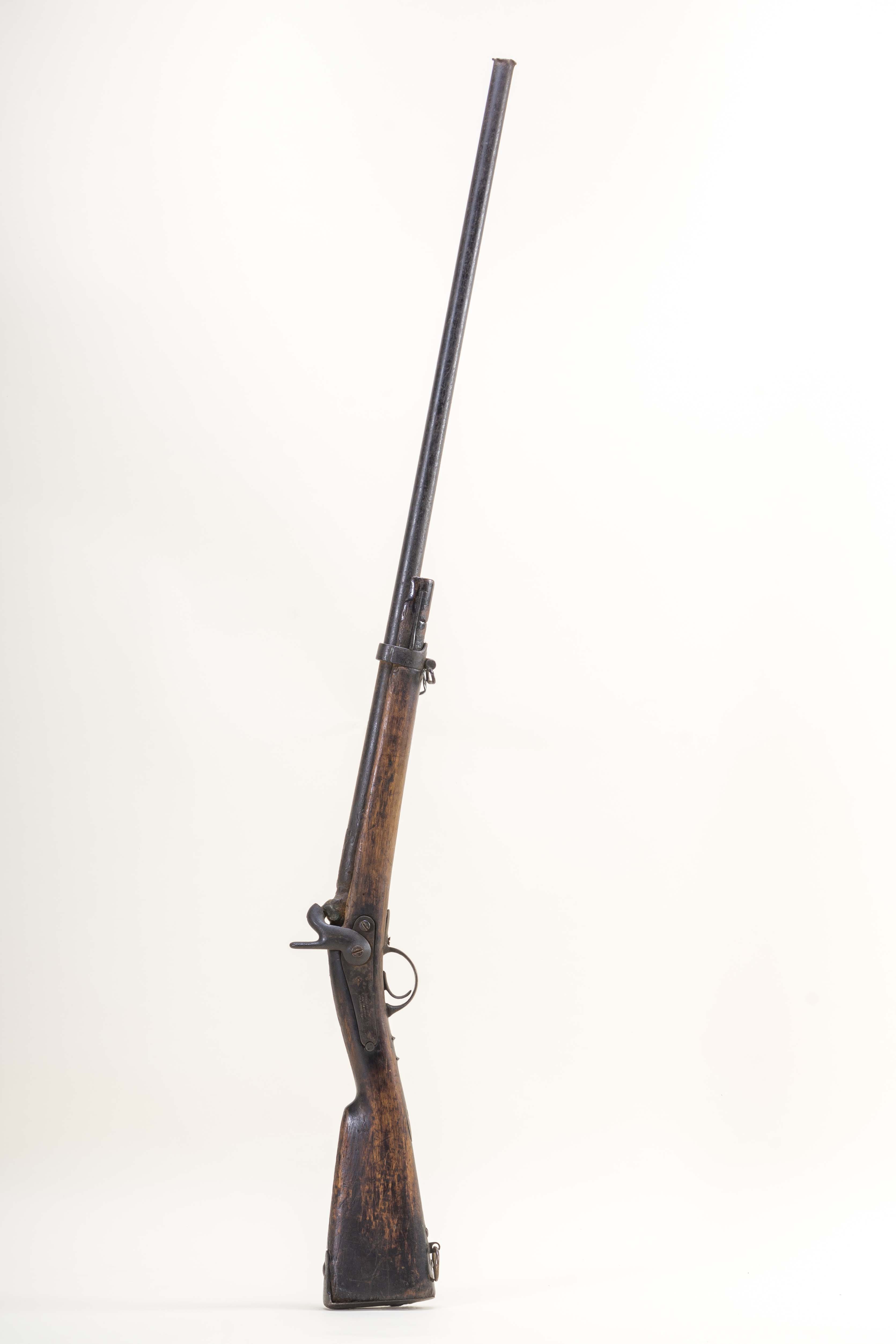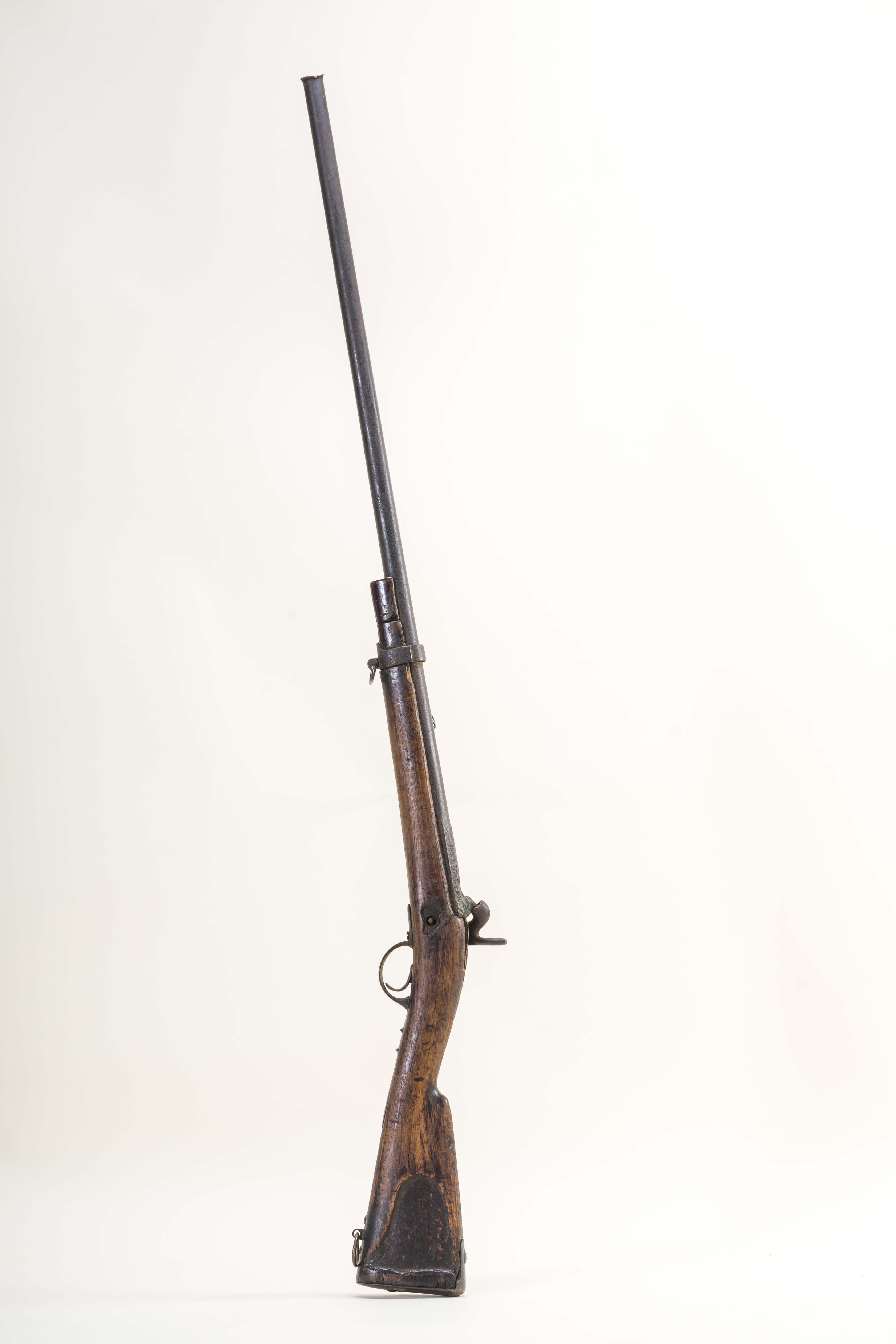 Arma de fuego portatil con sistema de avancarga. Constituida de caja, mecanismos y cañón. Caja de madera compuesta de cureña y caña de madera, coz de acero; cureña con socavón en su lado izquierdo y una anilla en su parte inferior. Abrazadera en el extremo de la caña junto al cañón, rematada en una anilla. Mecanismo de disparo de acero decfulminante, guardamonte y zepote de acero. Cañon de acero simple, de ánima estriada con boca irregular. Sin baqueta.