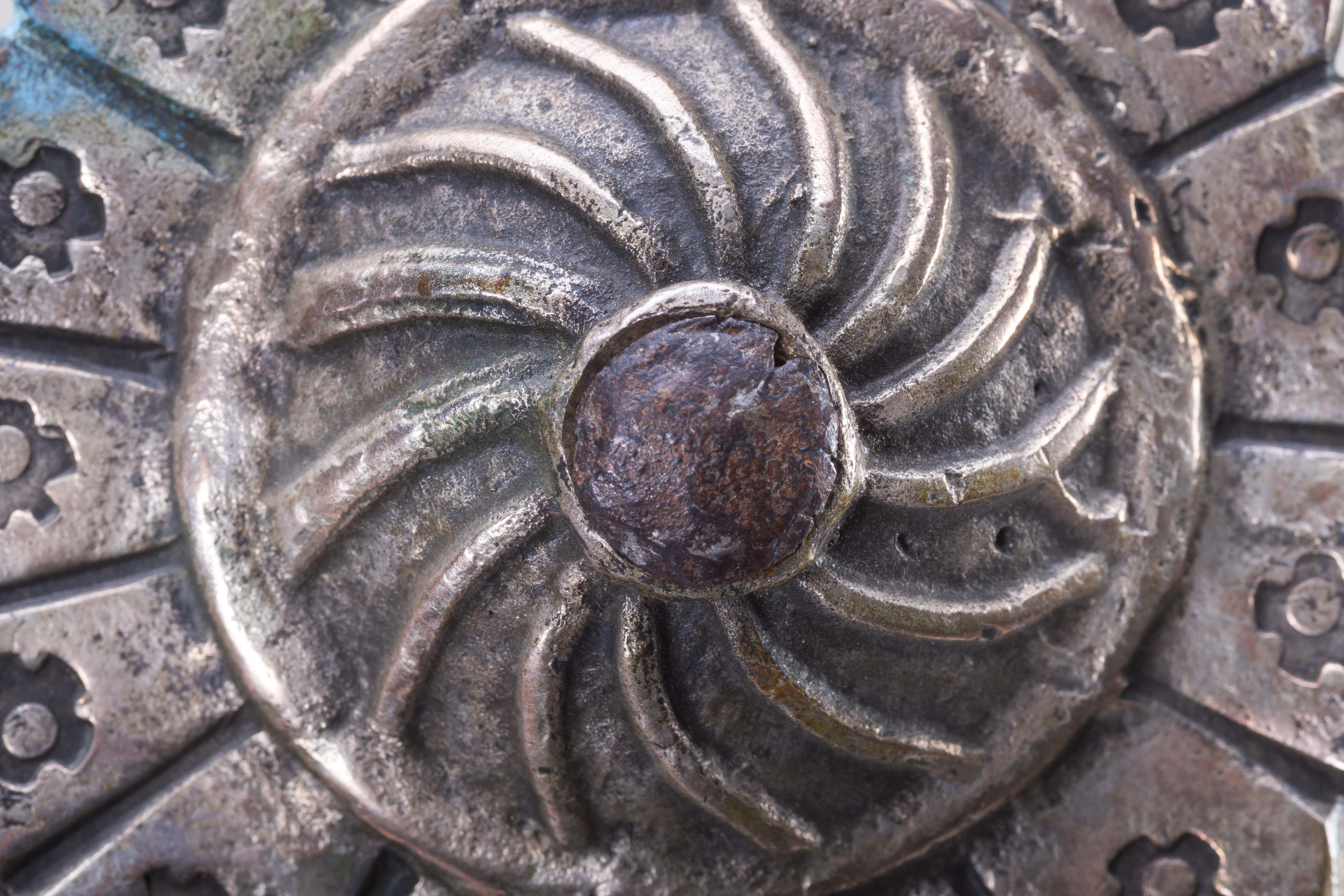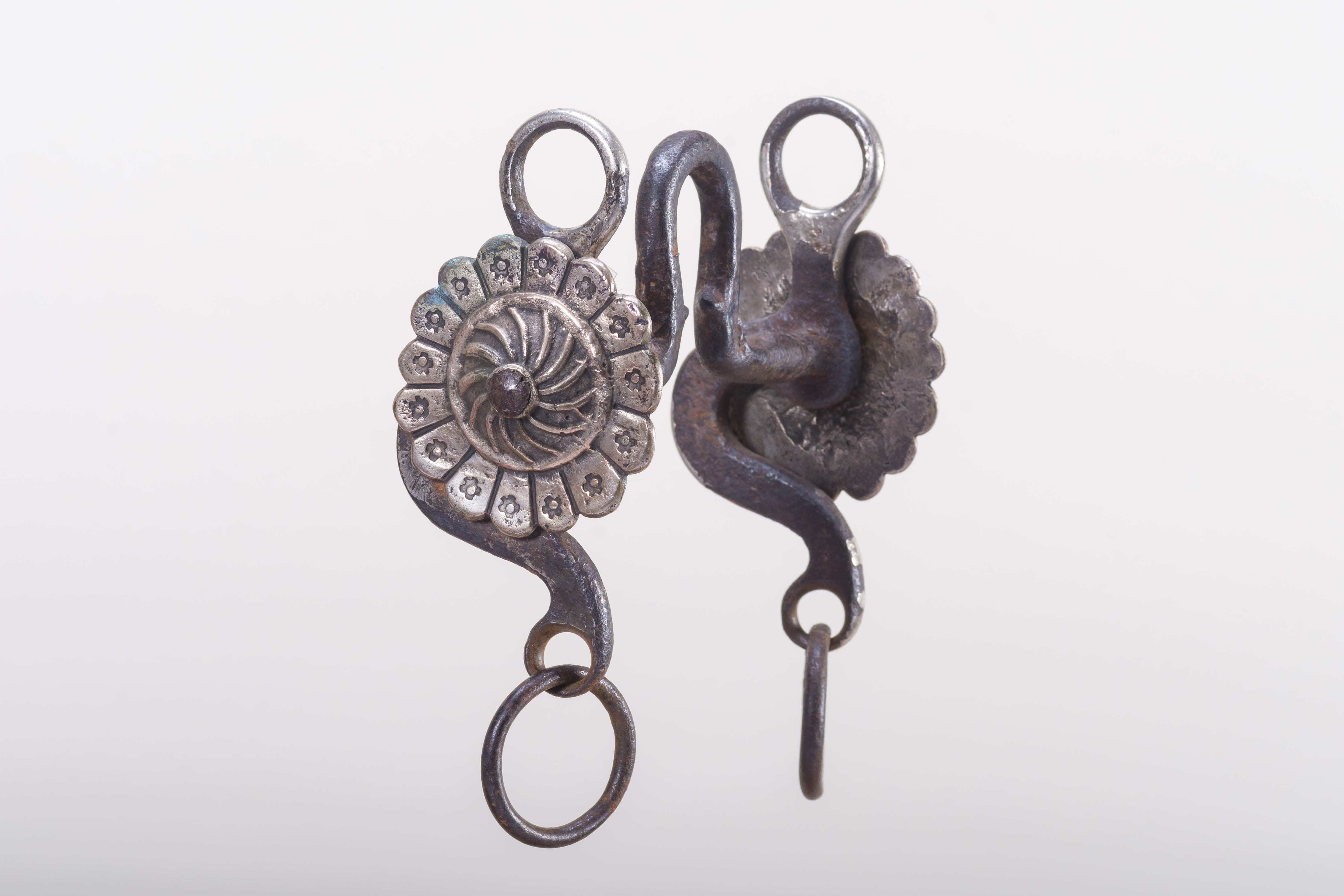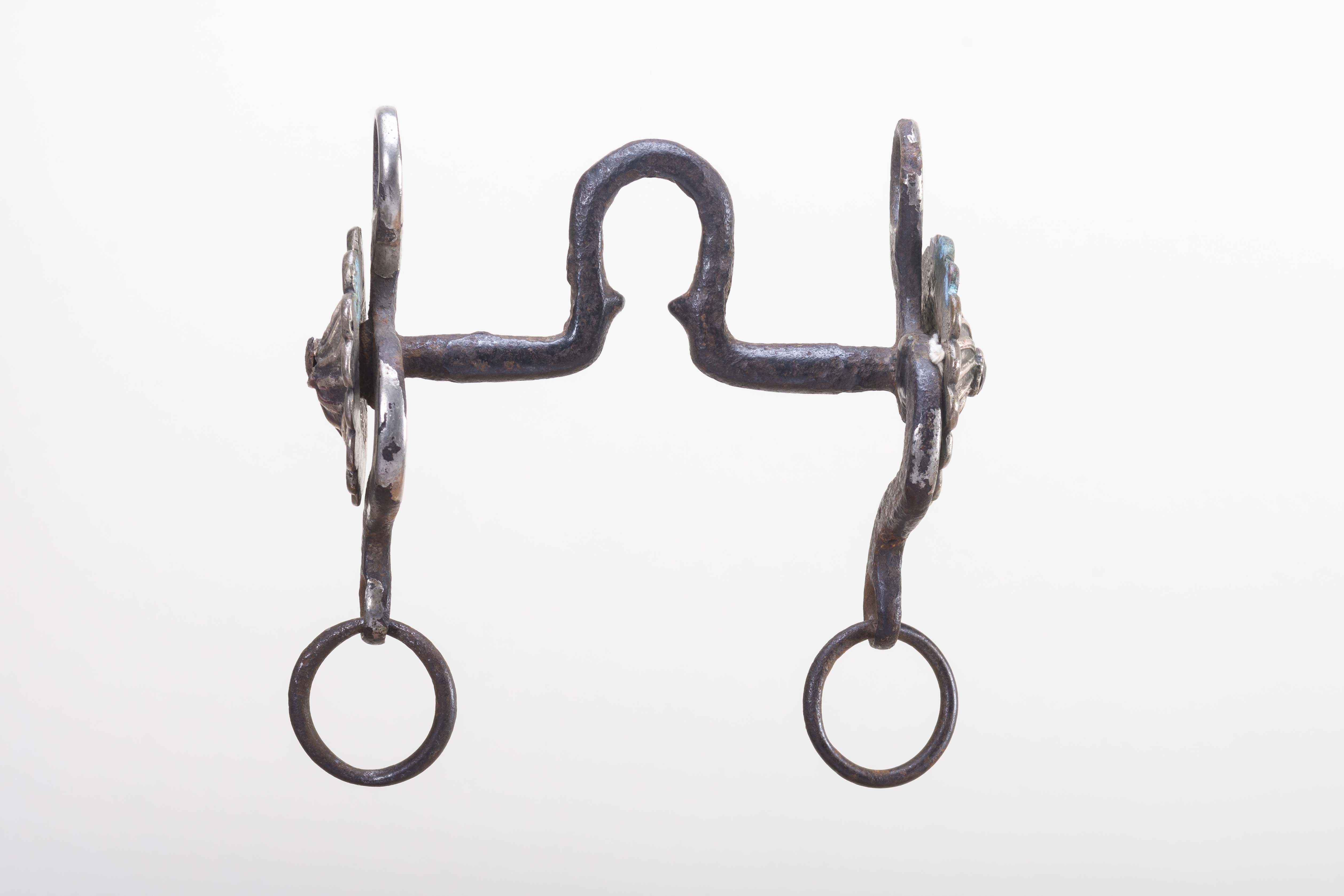 Instrumento de metal usado por el Jinete para controlar la cabalgadura. Se coloca dentro de la boca del animal y se maneja a través de las riendas. Su forma similar a una T compuesta por argollas, placas curvas y tubos solidos de metal de hierro. Presenta dos decoraciones de floretes de metal (no hierro) con decorados lineales por insición y sobrerelieve, uno en cada barra. El bocado tiene forma de medio ovalo elaborado con tubo solido de hierro. Acabado opaco.