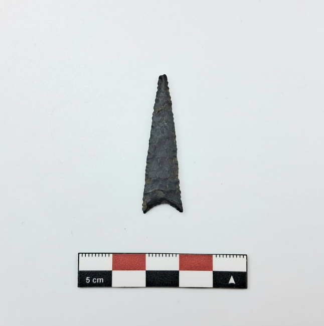 Punta de proyectil lítica elaborada mediante talla bifacial. Presenta una forma general triangular alargada, con base provista de una escotadura de arco suave y aletas laterales. La sección es biconvexa y delgada. En ambas caras se observan negativos de lascado, así como retoques marginales finos, continuos y regulares, probablemente realizados mediante presión.