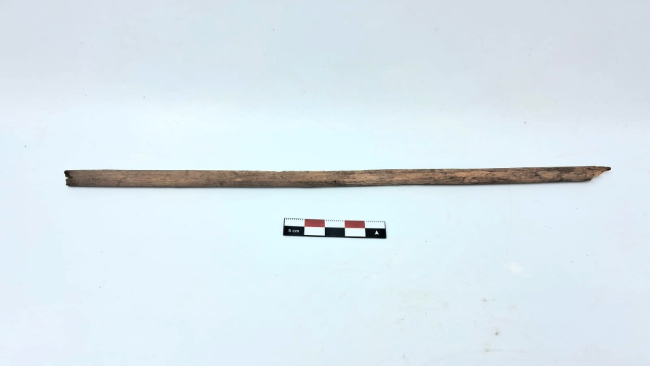 Varilla de madera liviana y hueca. Presenta fracturas en ambos extremos que dificultan su lectura. Se estima que corresponde a un vástago de proyectil disociado.