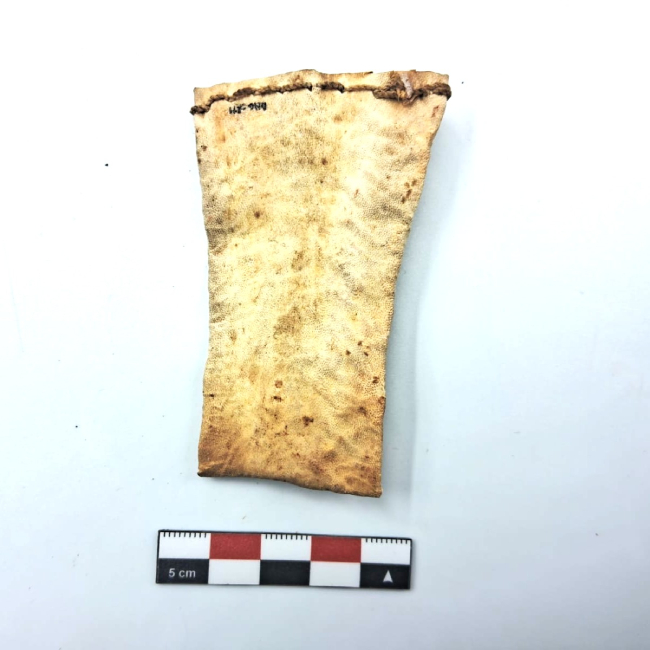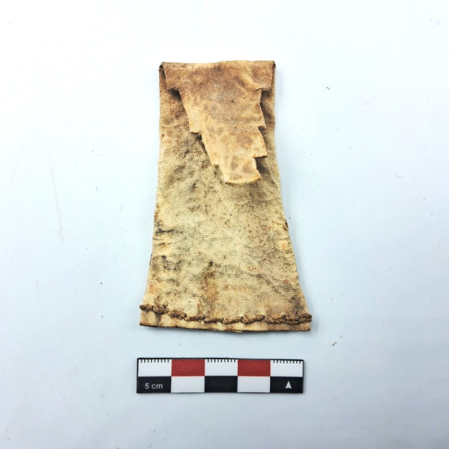 Contenedor confeccionado en cuero, de forma rectangular alargada, elaborado a partir de una sola pieza principal plegada y cosida longitudinalmente. Presenta costura visible en uno de sus extremos, realizada mediante puntadas simples. Tiene una tapa con diseño escalerado.