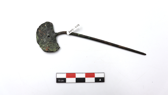 Adorno de metal formado por una placa laminar en forma de medialuna y un alfiler que compone la mayor parte de la pieza a nivel longitudinal. La decoración consiste en un calado circular en la parte inferior de la placa, cerca del punto de unión entre esta y el alfiler. El calado tiene 0.2 cm de diámetro. El alfiler es de sección circular y punta redondeada. La placa está inclinada hacia un lado.