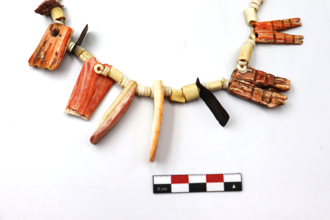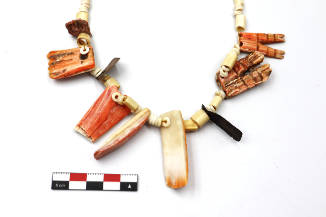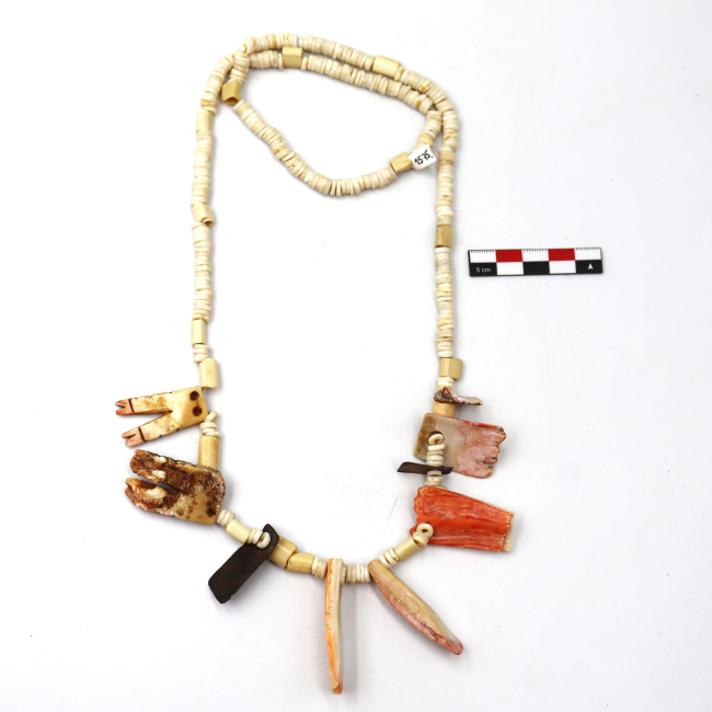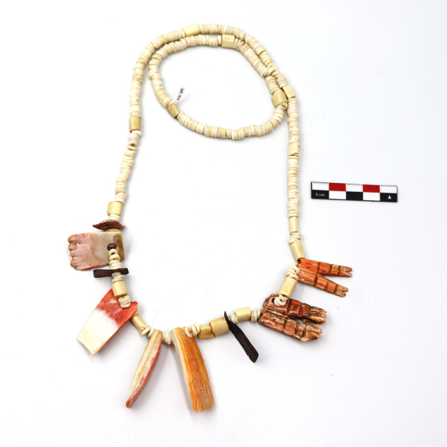 Adorno de uso personal utilizado alrededor del cuello, compuesto por una sucesión de cuentas y colgantes ensamblados sobre un cordón flexible. Está elaborado a partir de cuentas de material malacológico, mullu, óseo y placas laminares de metal. A lo largo de casi toda su extensión presenta una secuencia alternada de cuentas malacológicas y óseas: las primeras son discoidales de sección circular, mientras que las segundas corresponden a cuentas tubulares de sección irregular; ambas se encuentran pulidas y perforadas.