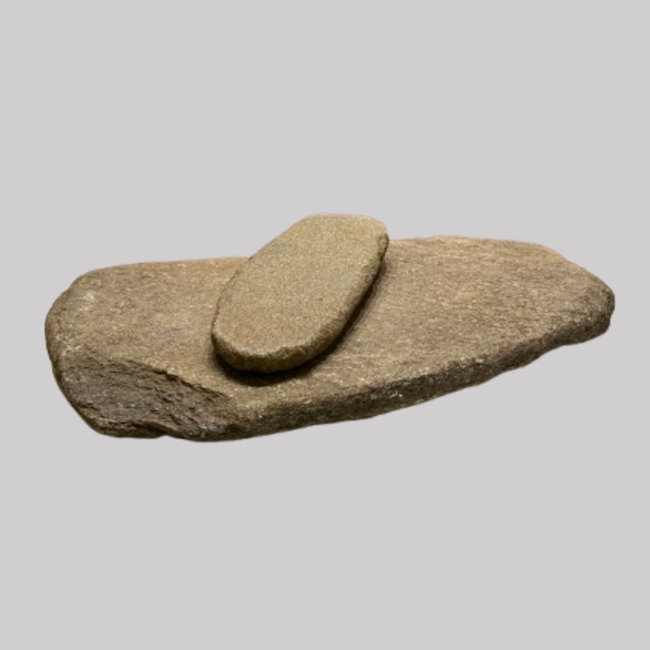 Herramienta de uso doméstico, generalmente destinada a la acción de pulverizar y/o machacar grano. Se compone de dos elementos independientes de forma aplanada y de color gris: una pieza mayor de piedra, de tendencia ovalada, con borde irregular y apariencia lisa en la superficie; y otra de menor tamaño, de forma alargada, de apariencia lisa y pulida en una de sus caras. La pieza de mayor tamaño presenta un corte diagonal en uno de sus extremos.