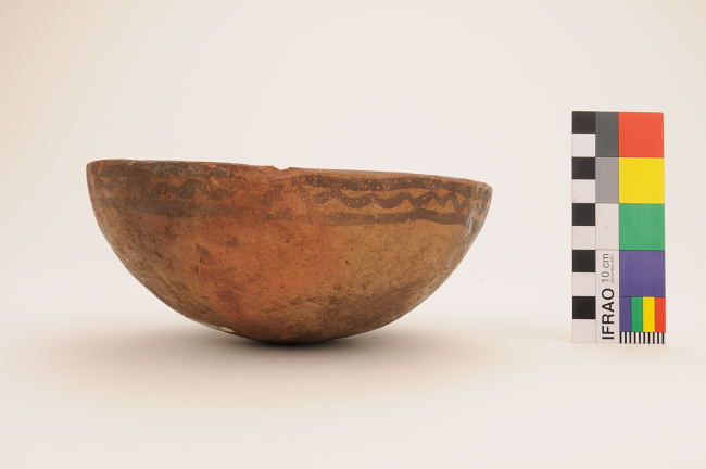 Contenedor cerámico subglobular. Engobado. Líneas paralelas y zigzag en el borde y decoración cruciforme en el interior. Exterior alisado, interior pulido
