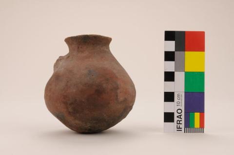 Pequeño ceramio globular. Boca restringida, cuello evertido, asa fragmentada. Superficie alisada sin decoración