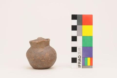 Ceramio globular de base plana. Cuello corto levemente evertido. Un asa borde/cuerpo. Superficie alisada sin decoración