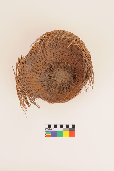 Contenedor tronco cónico de fibra vegetal. Base abierta, fibras entrelazadas a modo de asterisco. Paredes evertidas tejidas con técnica de acordelado, deformadas. Cordón torcido en el borde. Restos de pintura roja y aplicación de fibras embarriladas rojo y café